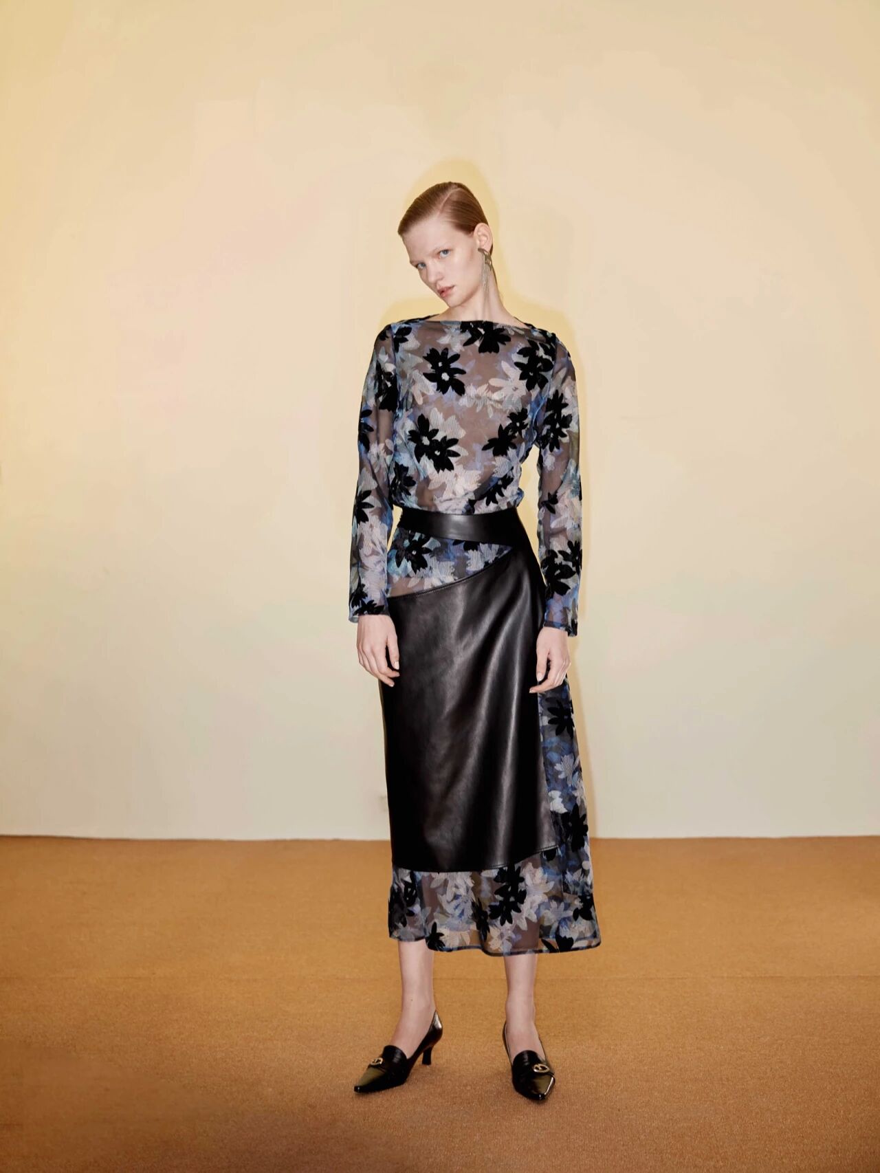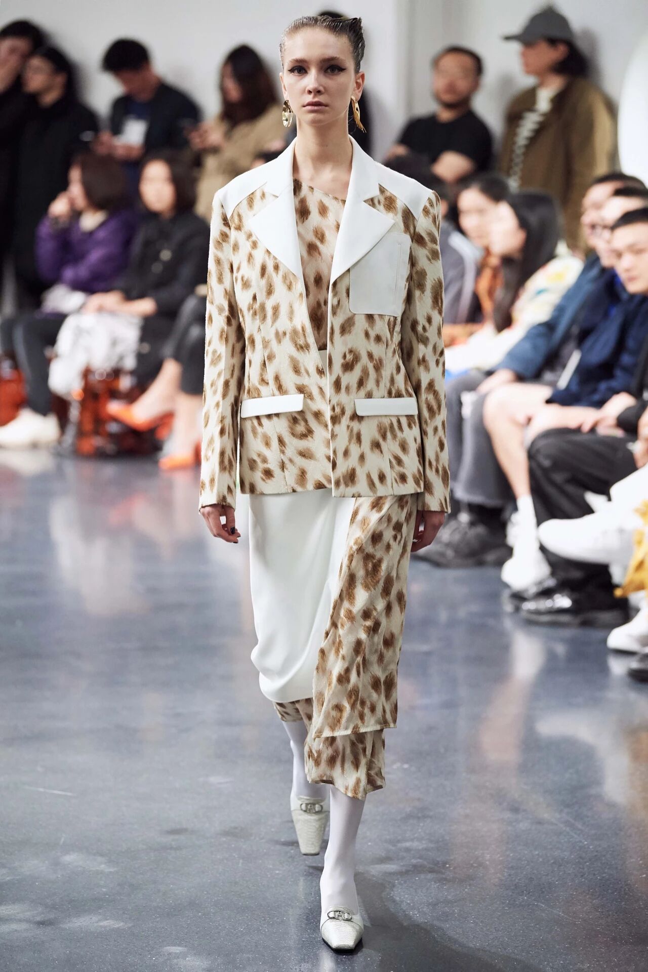 我们主要是在诠释女性成长的过程,这个过程是非常漫长的,我们仅仅是提取某一个时间点。比如在诠释女性内在矛盾体的时候,我们有用到质地比较厚重的皮革和经典的棉麻、化纤等西装材料,然后用他们去搭配蕾丝、真丝和轻透的丝绒,还有本季重点的豹纹提花,各种面料穿插在一起做出层次的对比,但是看上去却是非常和谐的。另外,我们也尝试了一些隐藏在衣服里细节。比如大衣的腰带,在大衣的两侧分别设计一个洞口让腰带从内层穿出,这样一个小的解构能更加凸显女性的腰线,在视觉上拉长了比例;豹纹提花的半身裙结合白色面料做出不对称叠穿的效果,增加时装的层次感与空间感,同时也回馈到本季我们想表达的关于“过程”的感受。