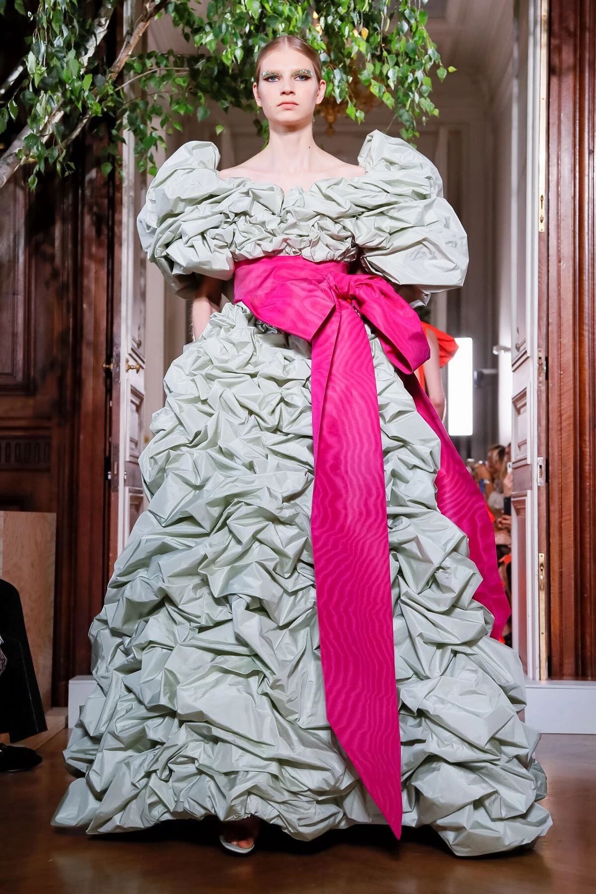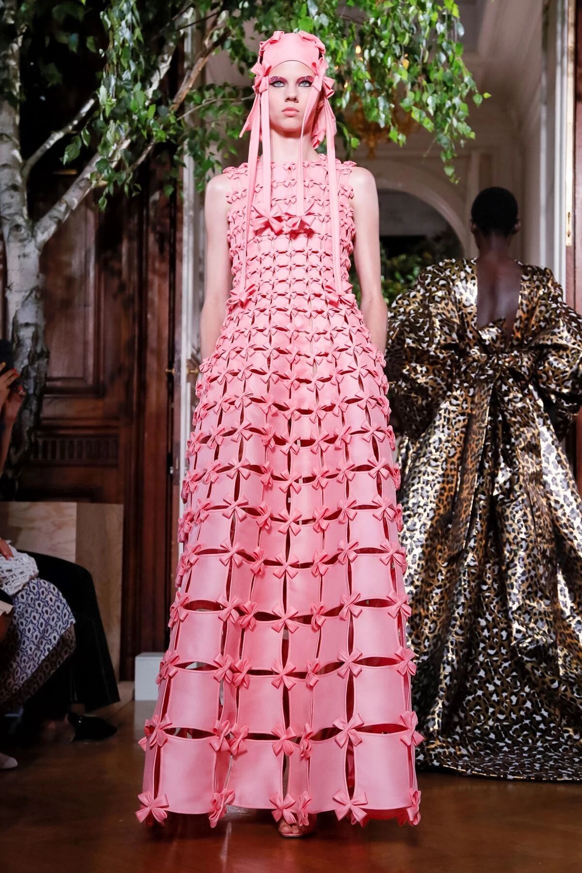 没有什么是不可以的,比如由18个工艺师花费4个月共同完成的500个粉色蝴蝶结镂空长裙,甚至夸张的毛球和造型奇特的头饰。