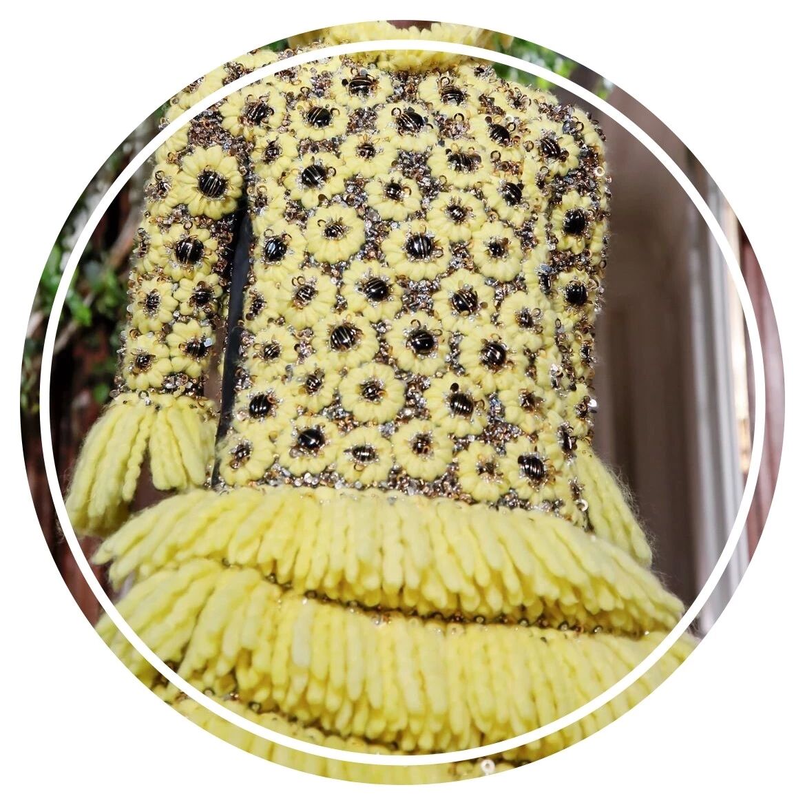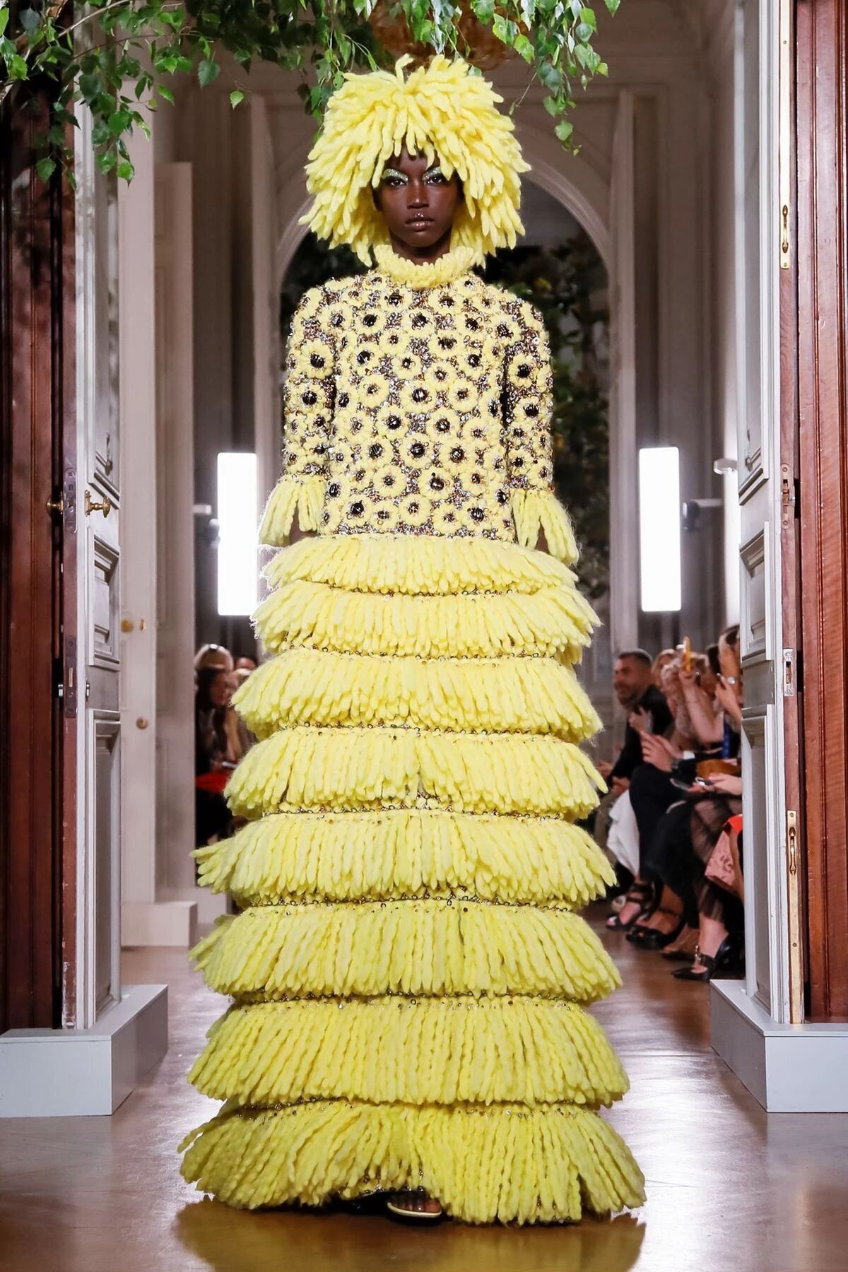 第一个模特穿着夸张的毛线钩花流苏裙缓缓出场,大胆夸张的毛绒流苏带着原始的狂野和强烈层次感。正如Piccioli说的:“这是一场信息量巨大的时装秀。”