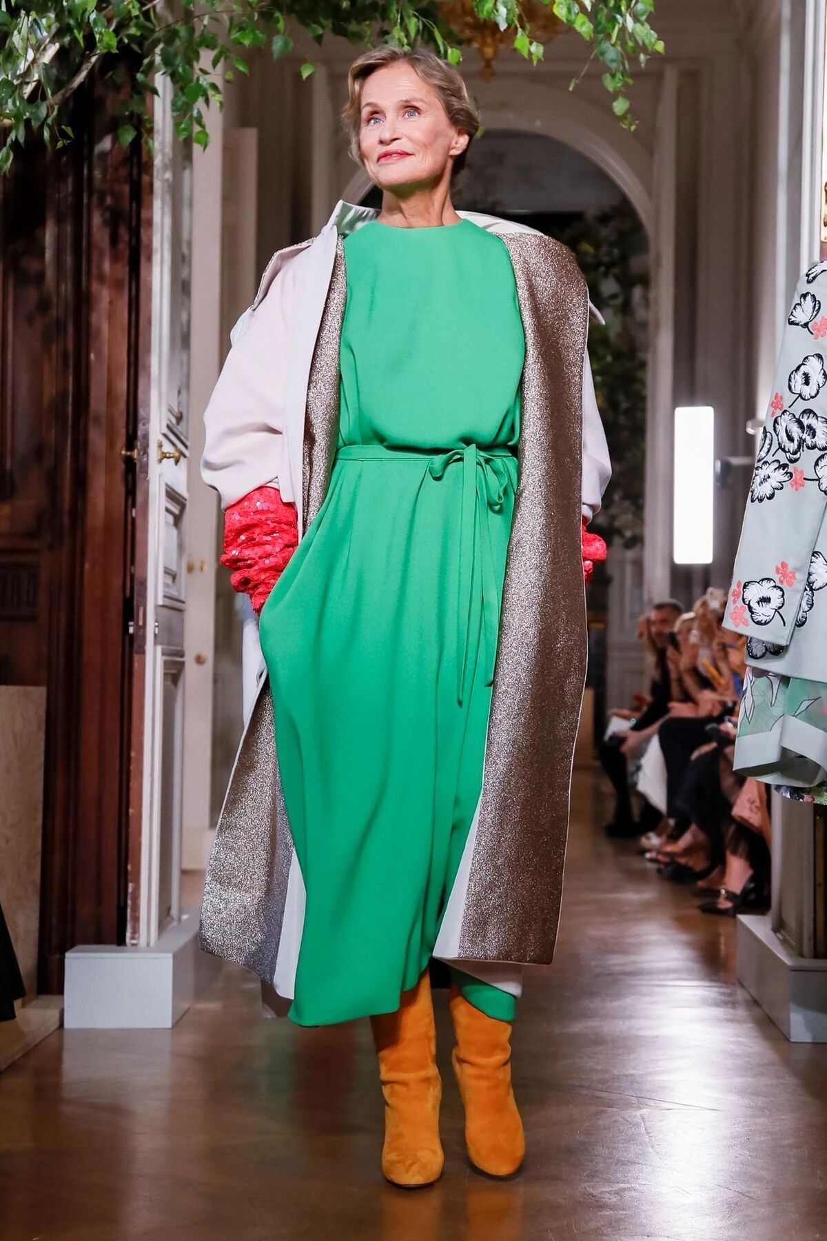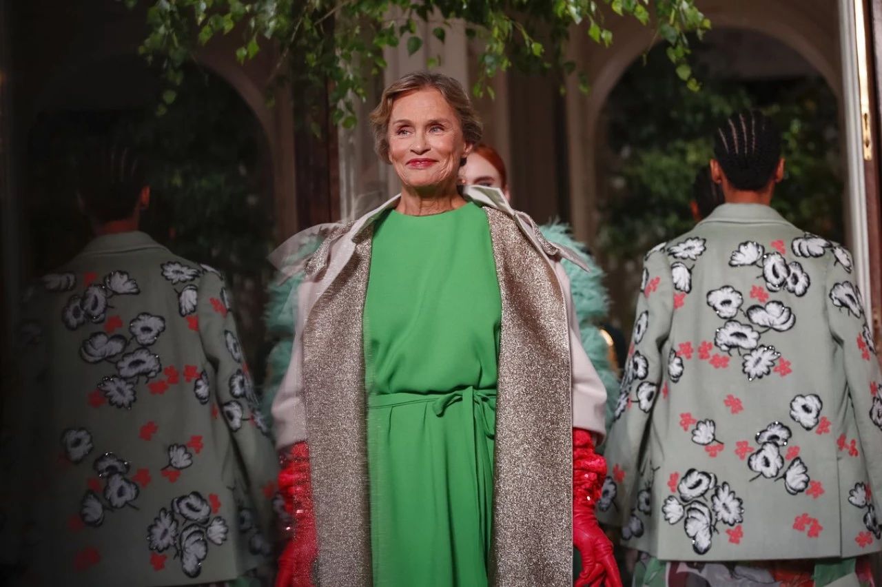 甚至还邀请到了已经76岁的顶级模特和女演员 Lauren Hutton 前来走秀,她穿着绿色连衣裙搭配翻领大衣和红色手套,走起秀来依旧神采奕奕。
