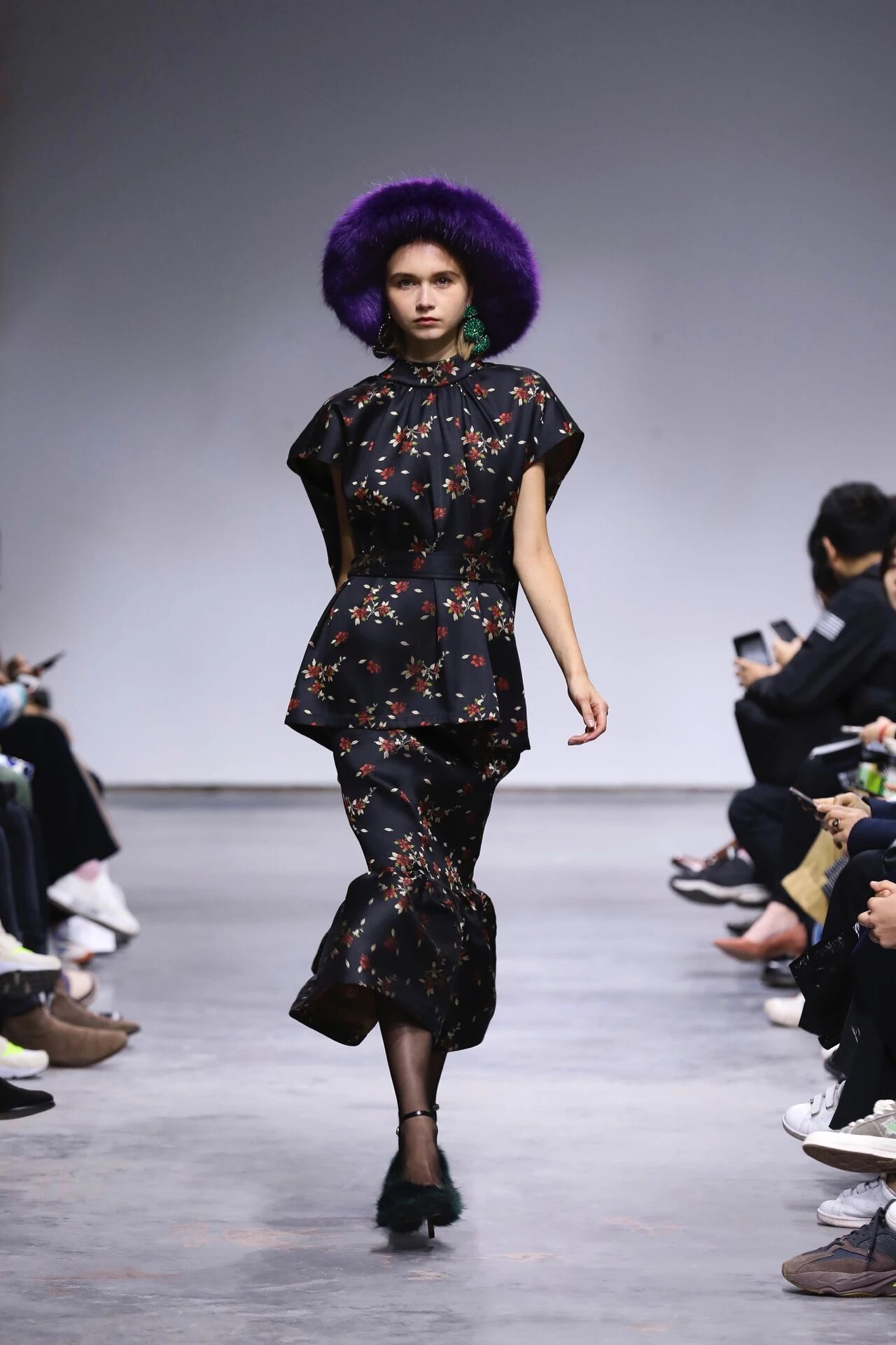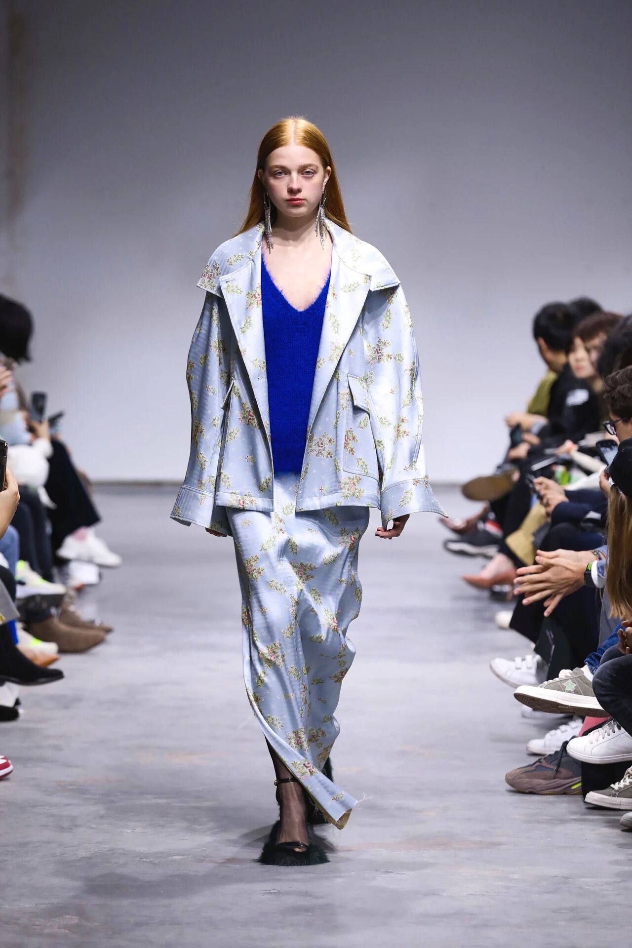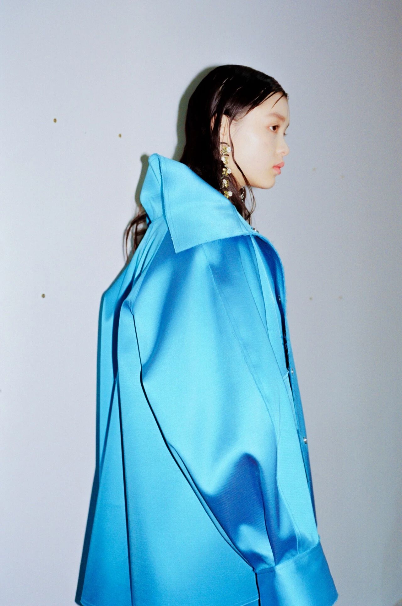 被加强的肩部廓形与插肩袖、泡泡袖以及多褶皱装饰做到恰如其分的融合,既天真浪漫又富有张力,将本季讨论的处于对立面的女性形象上升到时装成衣之中。色彩以外,极富光泽感的面料也是Ming Ma从创立开始就被大量运用的视觉风格,从2019春夏系列到如今即将上市的2019秋冬系列,高饱和度的纯色色块、布满花卉图案的印花装饰都不乏有光泽质感面料的辅助,经由灯光反射汇集在女性身边的朦胧光晕让她们虚实难辨,脸上是面带微笑、眼角含泪,抑或是眉头微锁。