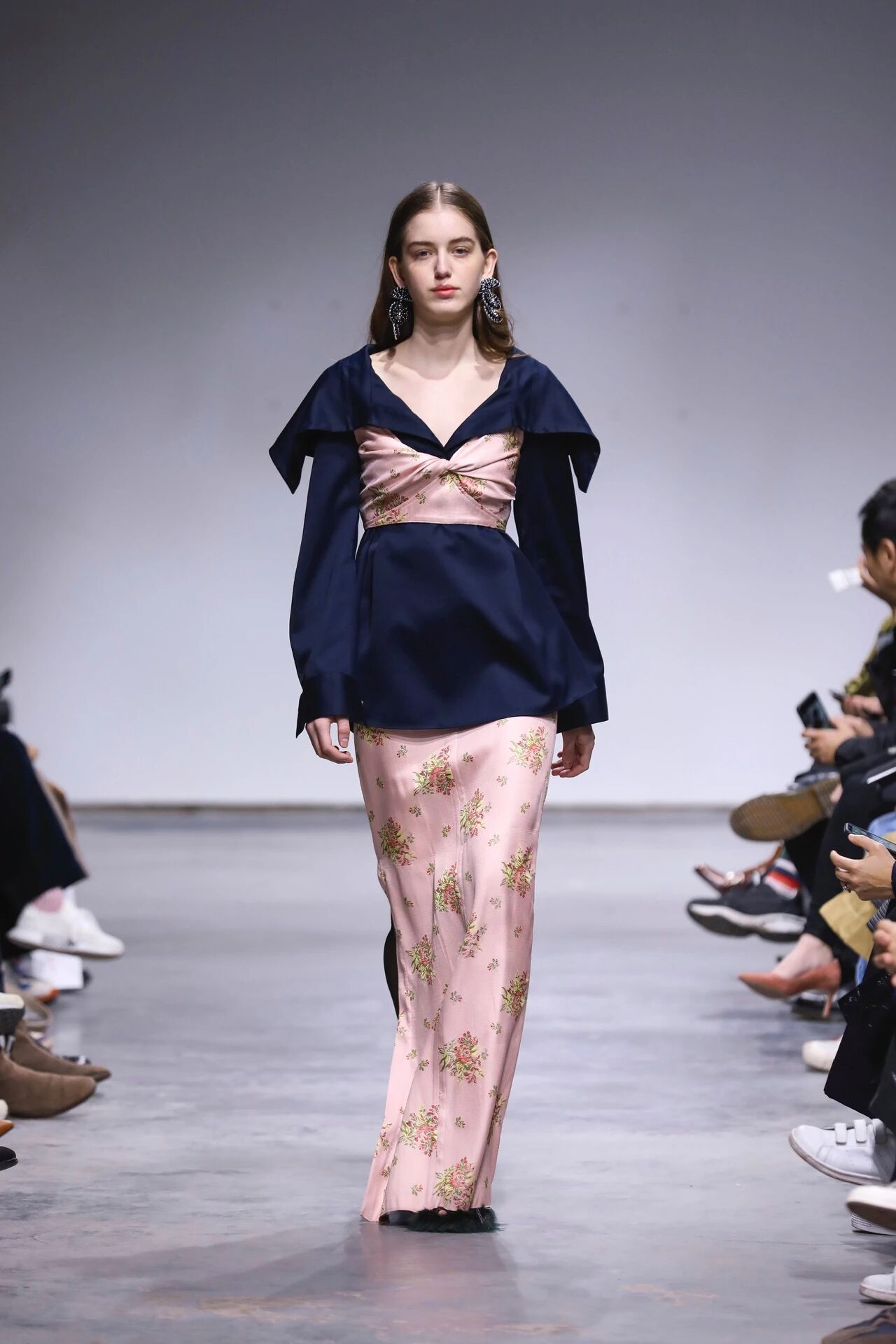 Ming Ma 2019秋冬系列,黑底中式花卉图案点缀的提花织物就藏了一份设计师刻意留下的秘密。正常情况下,完整的衣服会用柔软亲肤的里衬遮盖住服装的做工细节,而这一次,精美的背面纹路完全地展露出来,我们可以一睹提花织物正反两面的惊艳色差,观赏细如发丝的织线在相互交错后的纹理呈现。“看秀场图片是完全不能猜到我们在衣服里面居然做了这样的处理,非常惊喜。”