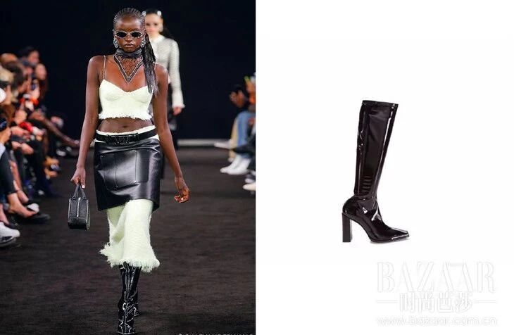 裙搭配黑色皮长靴和大耳环,将酷感和性感完美糅合。