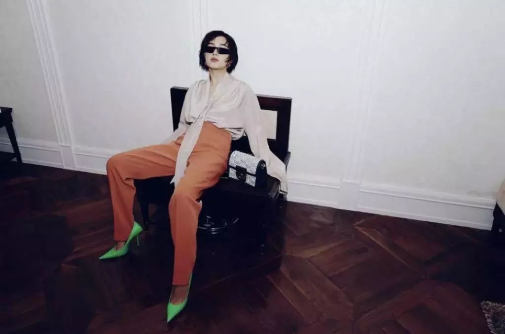 除了会挑鞋,还会“藏鞋”。超长的西裤完美地遮住了高跟鞋,打造一种“我本来就很高”的错觉,连旁边的男士都被比下去。