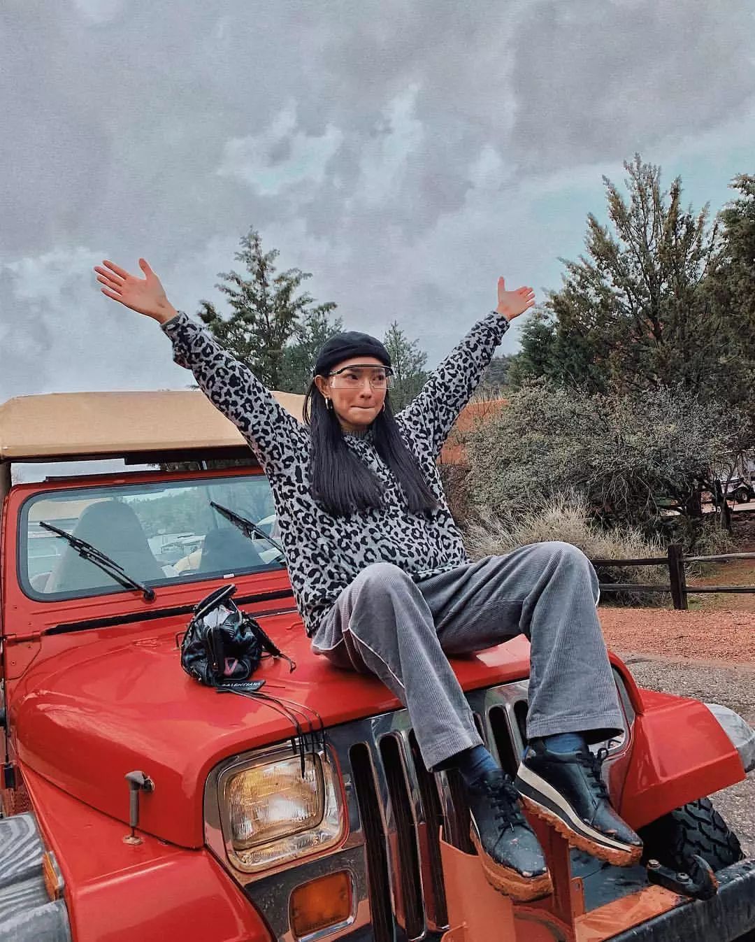 脚底没有贴边,真的很容易暴露出Chau Bui一米五几的事实。头上留的空间过多,就会在照片里显得整个人看起来很娇小。所以千万要避开这些雷区。