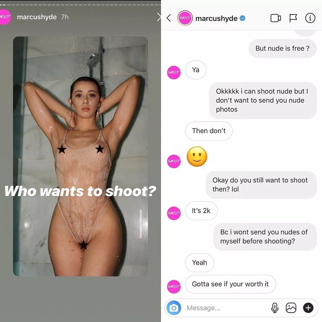一位来自洛杉矶的模特Sunnnaya表示有兴趣拍摄,Marcus Hyde回复拍摄需收美金,000,裸照的话就可以free,不过前提是必须在拍摄前发一张裸照给他审核,看看模特是否值得拍。模特拒绝这个无理要求后将对话截图公开,Marcus Hyde知道后开始辱骂模特。