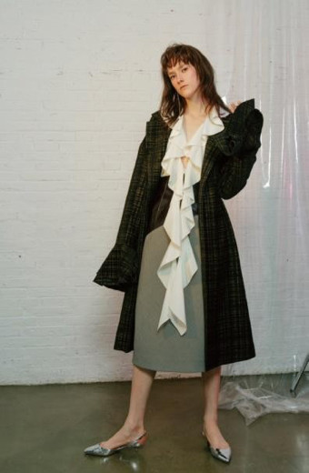 一眼看上去是基本款的小尖领衬衫,其实背后大有乾坤。超大的深V后背镂空露出性感的蝴蝶骨还不够,袖子上的堆褶设计又多了几分宫廷风的华丽感,沈忆恩用每一个造型力证着自己是个绝对够格的时髦精。