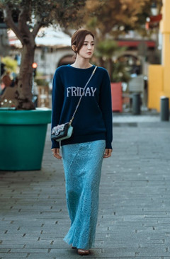 除了让人眼花缭乱的大牌包包,沈忆恩还经常搭配一款编织拼接的手拎包。没有任何显眼的品牌logo,却在质感中将高级感流露。