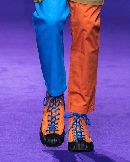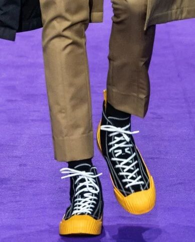 Kenzo 2019秋冬系列的秀场上就将饼干细节用在了鞋头和鞋底上,柠檬黄和橡皮粉包裹着帆布鞋面,打开了运动风和高级时装的结界,强势吸睛。