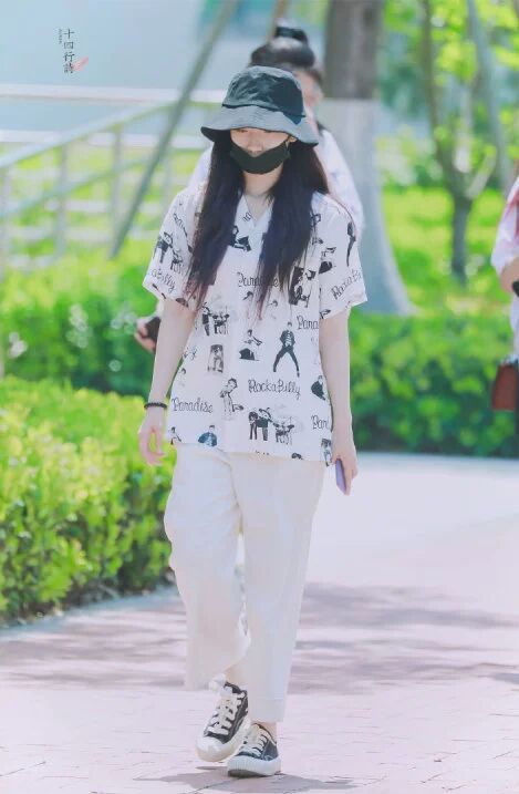 用波普风印花衬衫搭配小白裤,变身清爽小男生的孟美歧,穿的还是这双黑色饼干鞋。