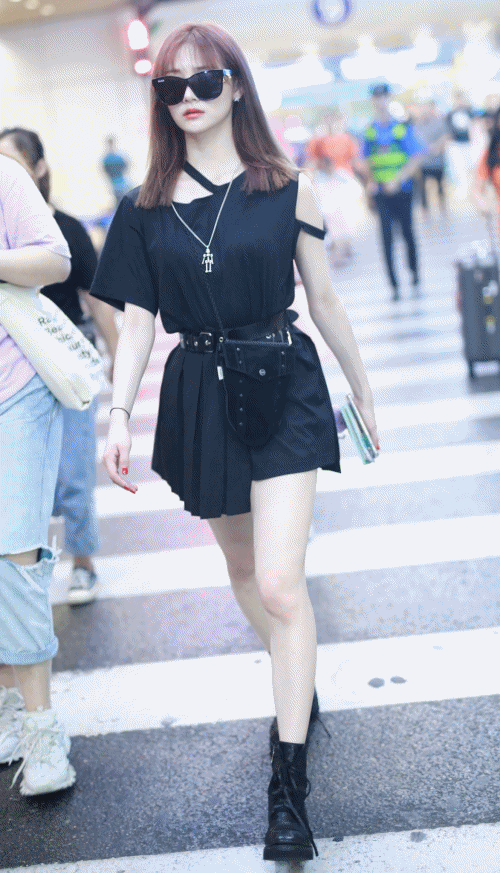 就像周洁琼的清凉的不对称黑色连衣裙原本是有趣可爱的,马丁靴加入后你看之前还是少女的感觉,换个动作立刻就酷了起来。