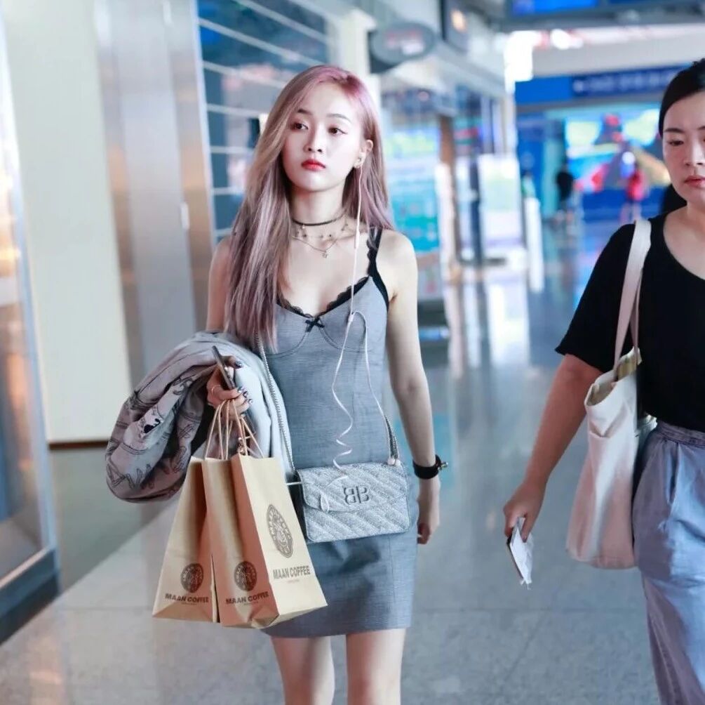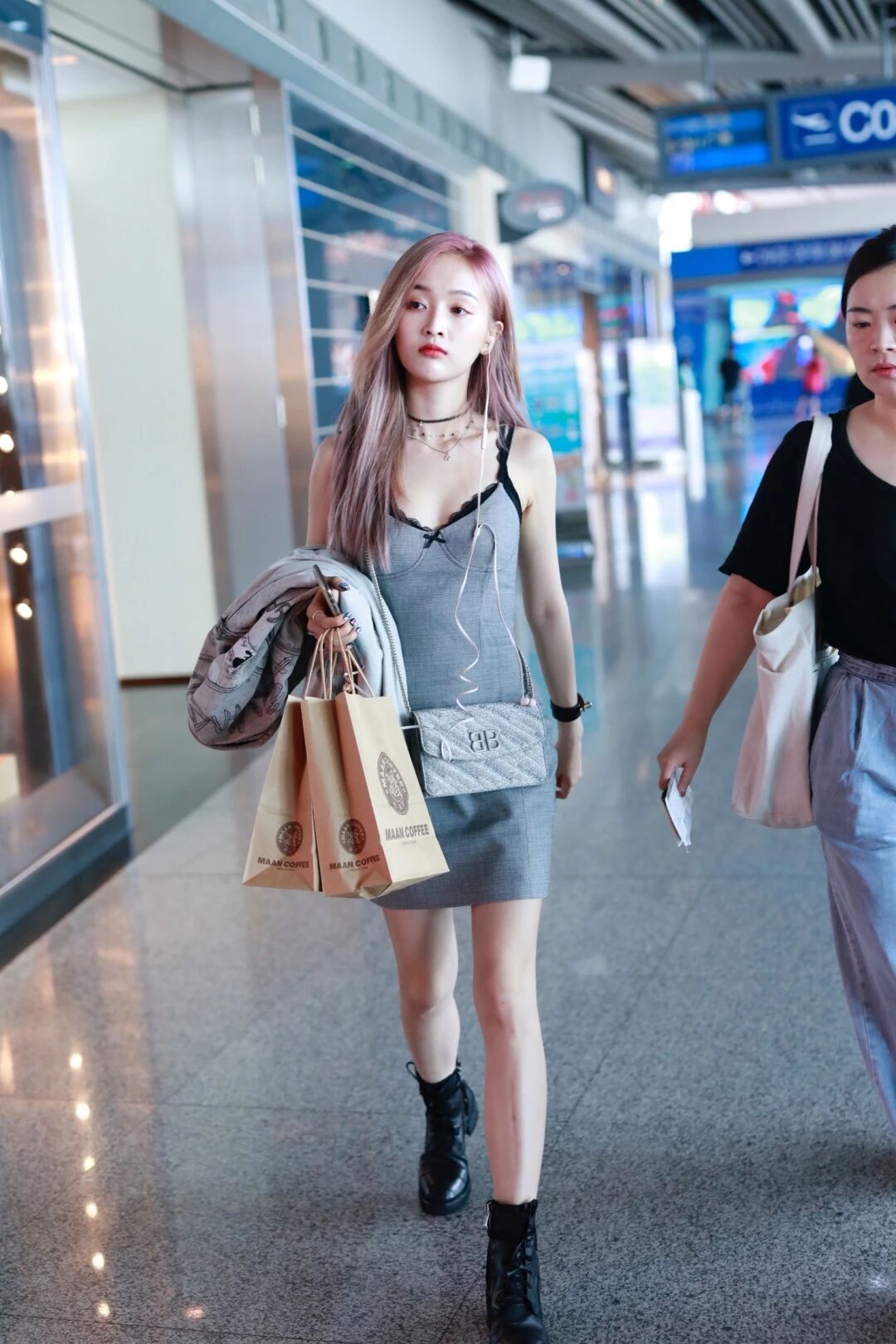 吴宣仪的Alexander Wang灰色吊带迷你裙,真是十分温柔少女,但是芭姐告诉你她的鞋子搭配十分有趣你能猜到么?