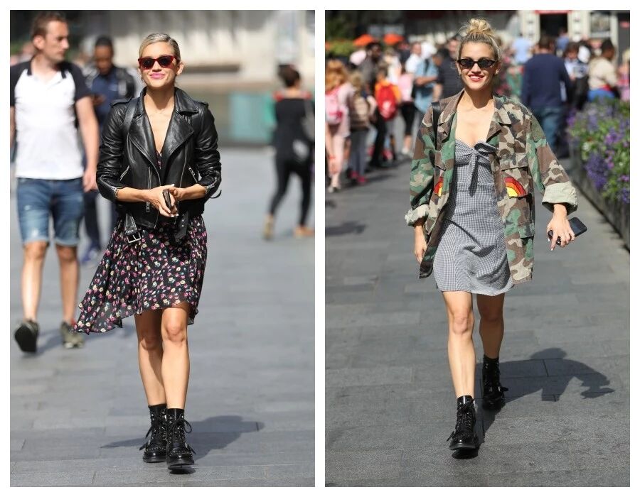 度假风自然不只有碎花连衣裙,你看Ashley Roberts的两套不同的度假风穿搭都少不了马丁靴。你看第二套内搭是简约的连衣裙。胸前还有个蝴蝶结,外面披的迷彩外套随性又舒适,像不像突然被男友拉起来出门的你。