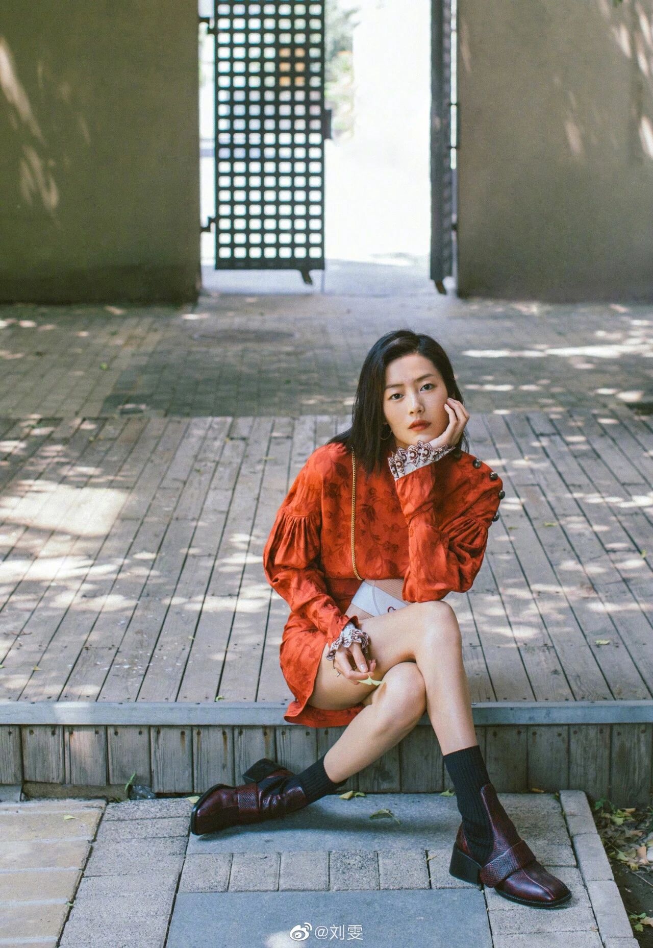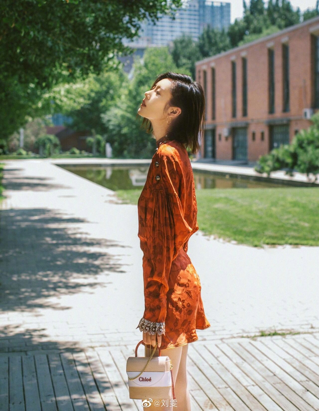 表姐刘雯最近在一组照片中身穿橘色花朵连衣裙手拎Chloé,抬头侧脸纤细动人。