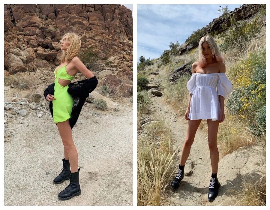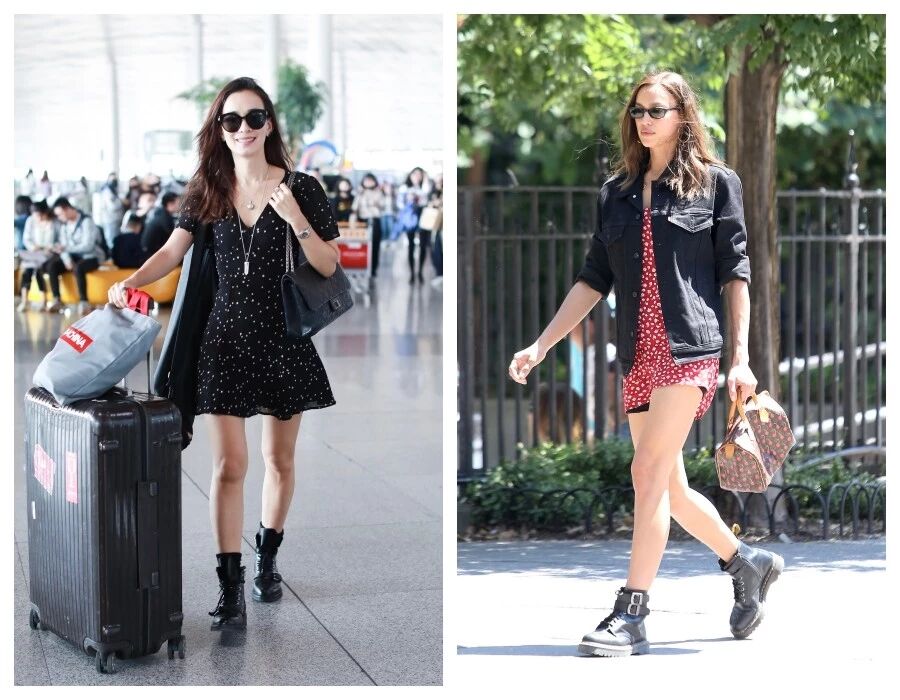 如果你担心马丁靴不好搭配,那你看看就连度假的波点碎花连衣裙都跟马丁靴搭配的很好。不管是卢婧姗还是Irina都用马丁靴诠释了那种慵懒与放松,戴上墨镜即可出发吧。