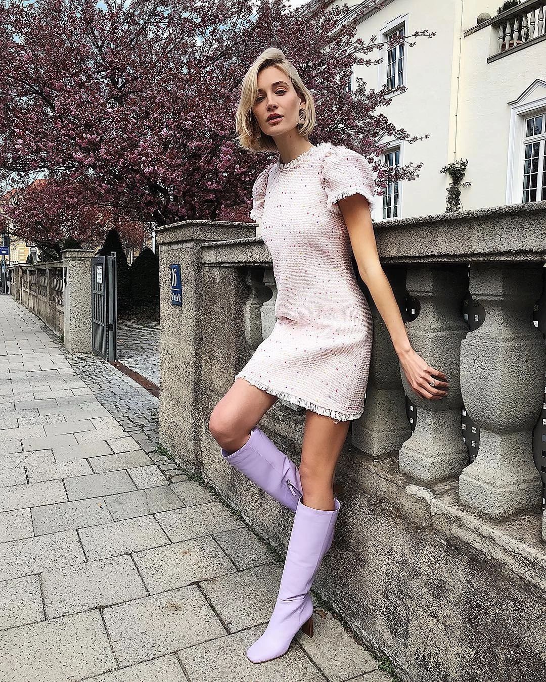 这种粗呢的连衣裙真的是十分优雅,但有的时候就怕“太优雅“的穿搭会像Office Lady有点显老!这时候换一双高筒靴打破平淡,浅紫色也更活力。