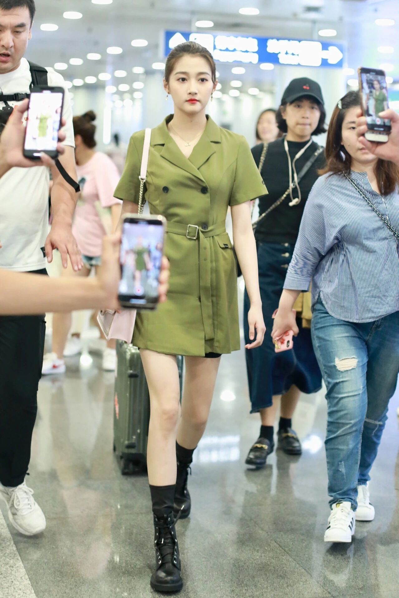 关晓彤的绿色风衣式连衣裙,虽然色彩清新,但是因为包包的搭配还是有些“成熟”。晓彤很巧妙的用马丁靴将整体的感觉又变得活泼了起来。