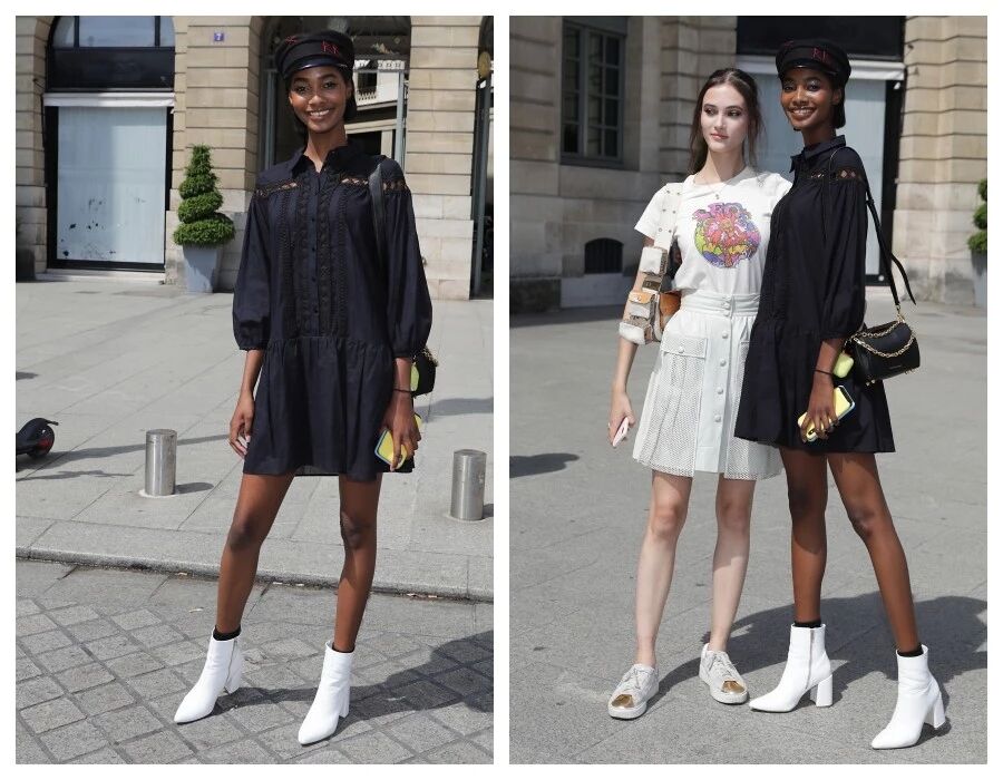 如果不对比我相信你也不会发现原来一个脚踝靴就有“翻天覆地”的变化,黑色娃娃裙跟白色脚踝靴产生了奇妙的化学反应。