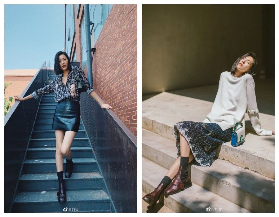 而且刘雯也不是第一次穿这双靴子了,一样的都是春夏的穿搭加上秋冬季的靴子,你别说还真的有些独特,很时髦呢!