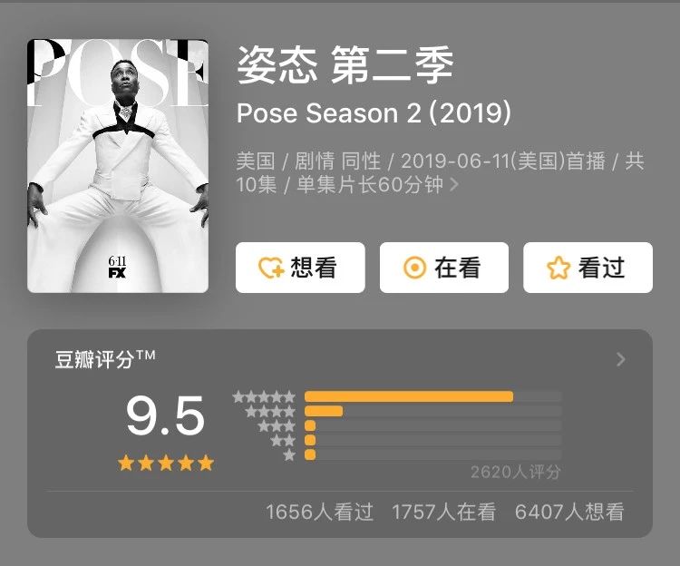 没错,它就是由《美国恐怖故事》、《宿敌》导演Ryan Murphy所打造的《姿态》(Pose),目前第二季也已经拉下帷幕,豆瓣评分达到9.5分,还获得了2019艾美奖的提名,好消息是第三季已经确认续订。