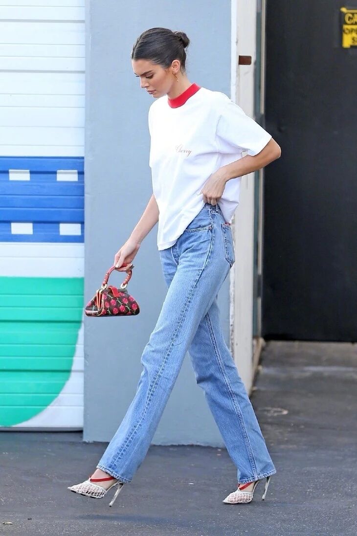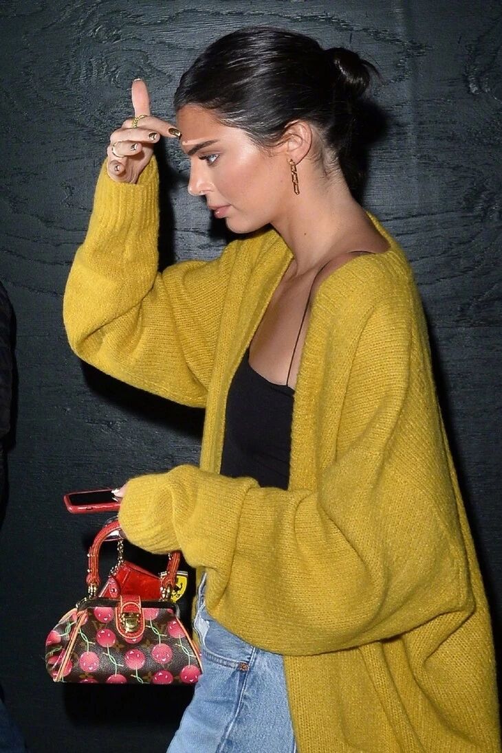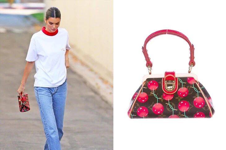 Kendall还拎过一只卡通樱桃印花手提包出街,包包上大面积的红色与T恤领口的红色锁边还巧妙地呼应了一波~