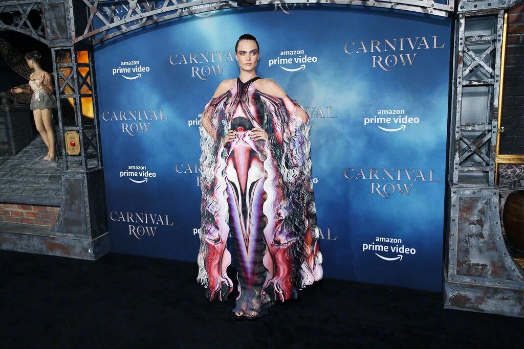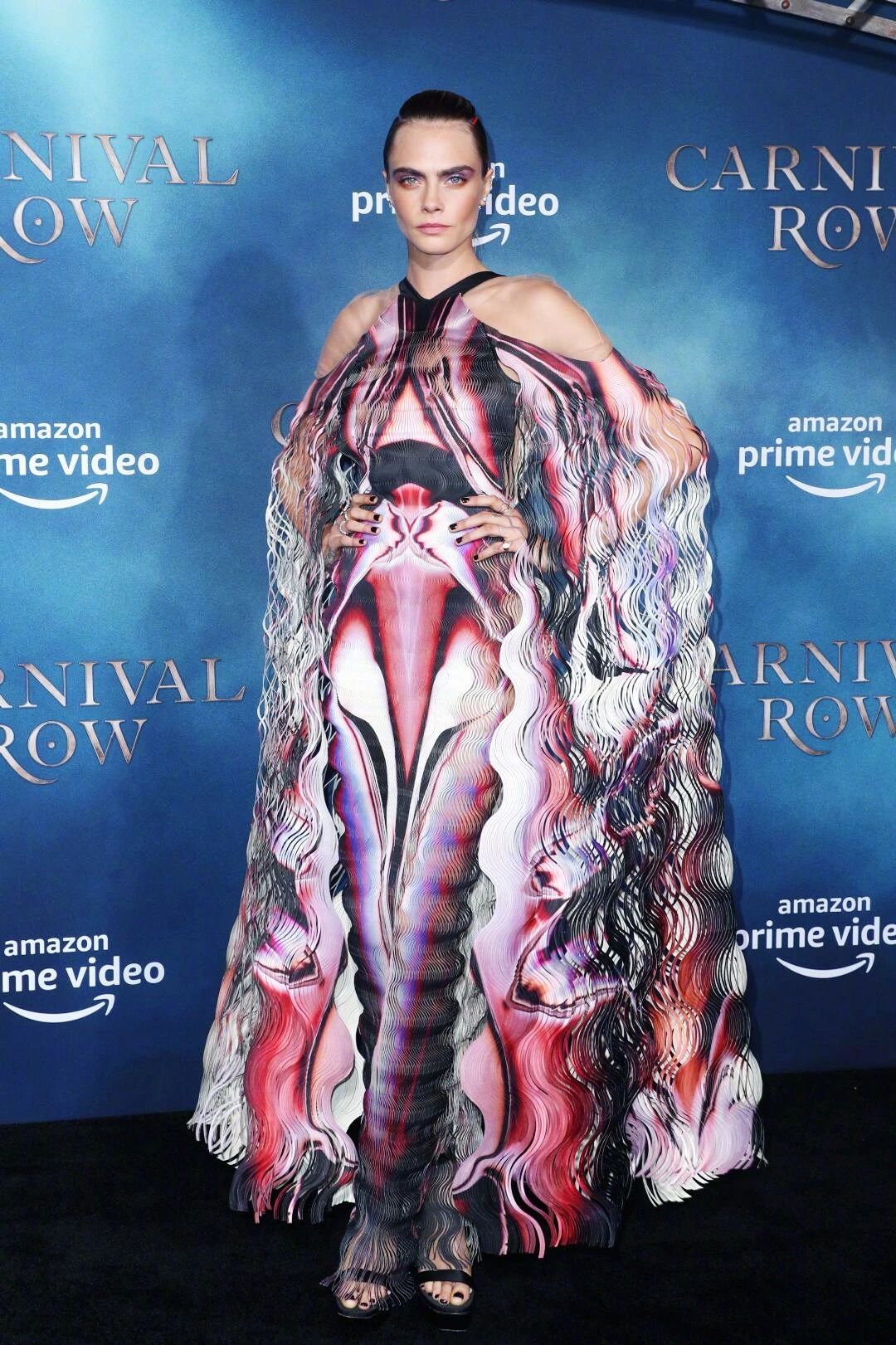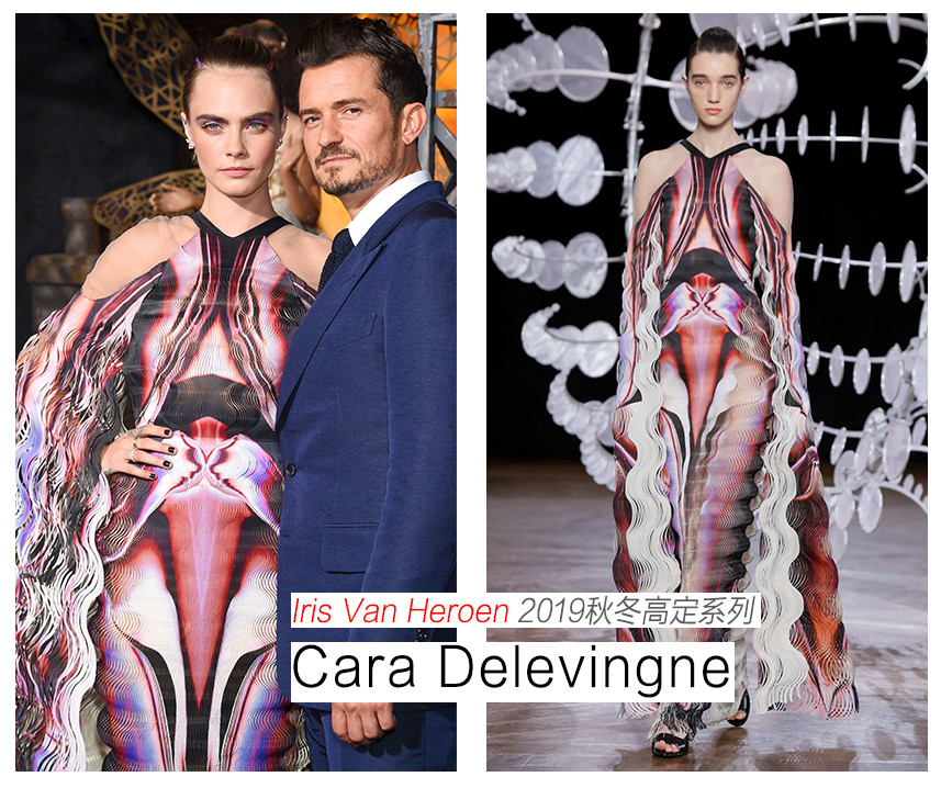 敢穿Iris Van Heroen的女人向来都不简单,这身极具科幻感的设计大概只有Cara这鬼马的气质才撑得起来吧。剪纸般流动的水波纹,让鲜艳的花卉图案有种在看海底世界的错觉。