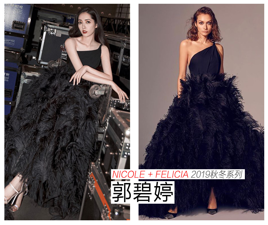 郭碧婷黑白两套礼服上演白天美到黑夜,黑色羽毛礼服还原五十年代好莱坞名媛范儿,单肩拧股设计抓获了骨肩的性感,黑色羽毛带来的戏剧张力与妹花温婉的气质互补才不显艳俗。