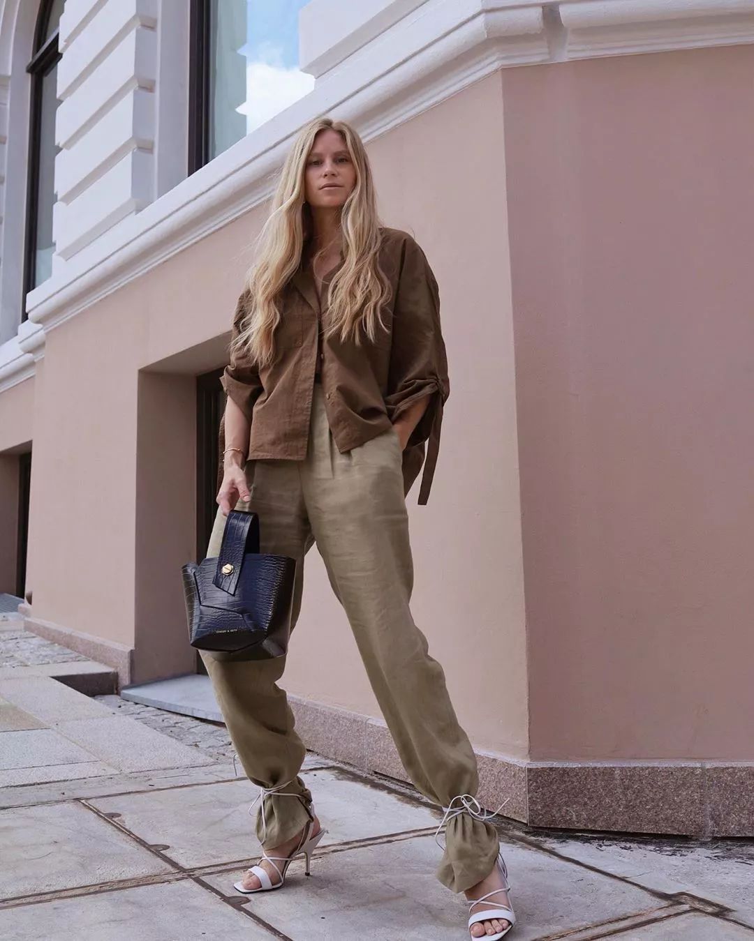 亚麻材质的服装穿不好很容易松垮,没有脚踝处的收紧会显得人没有气色,但是收紧后就像平时出门嘴唇涂了口红似的出彩。