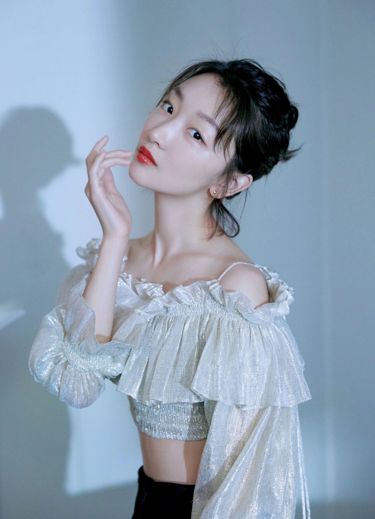珠光面料中泛着金丝线,周冬雨用自己的肤色穿出了贝母的海光。腰部精密收紧的褶皱和肩上微放的荷叶,像极了海底世界的珍贝蛎壳。
