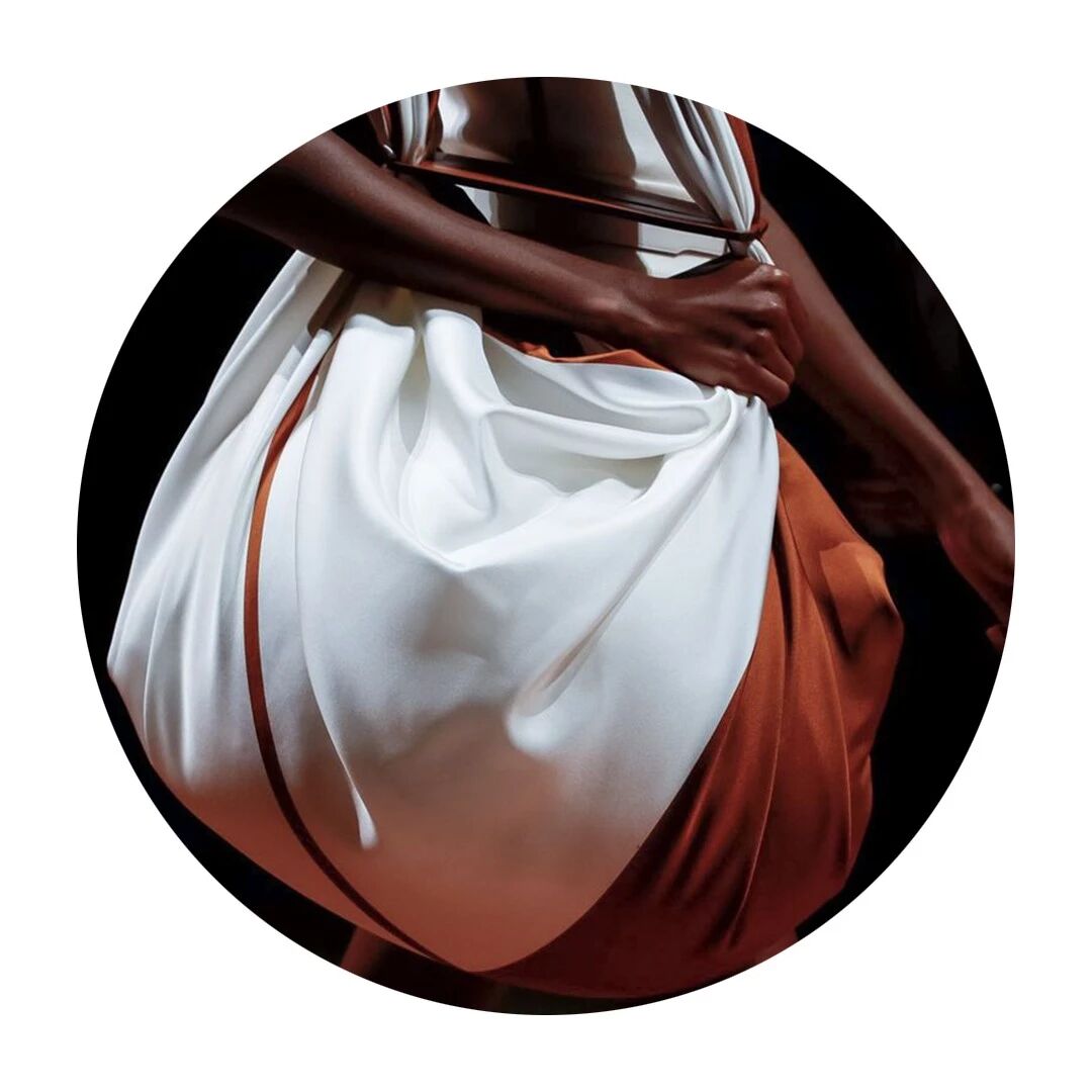 令人惊喜的是,丝巾在这一季也被设计成了不规则形状的包袱手袋,丝滑的面料形成自然的褶皱,横条皮革隔断的创意新奇又个性十足,在不经意间将潇洒人间恣意流露。