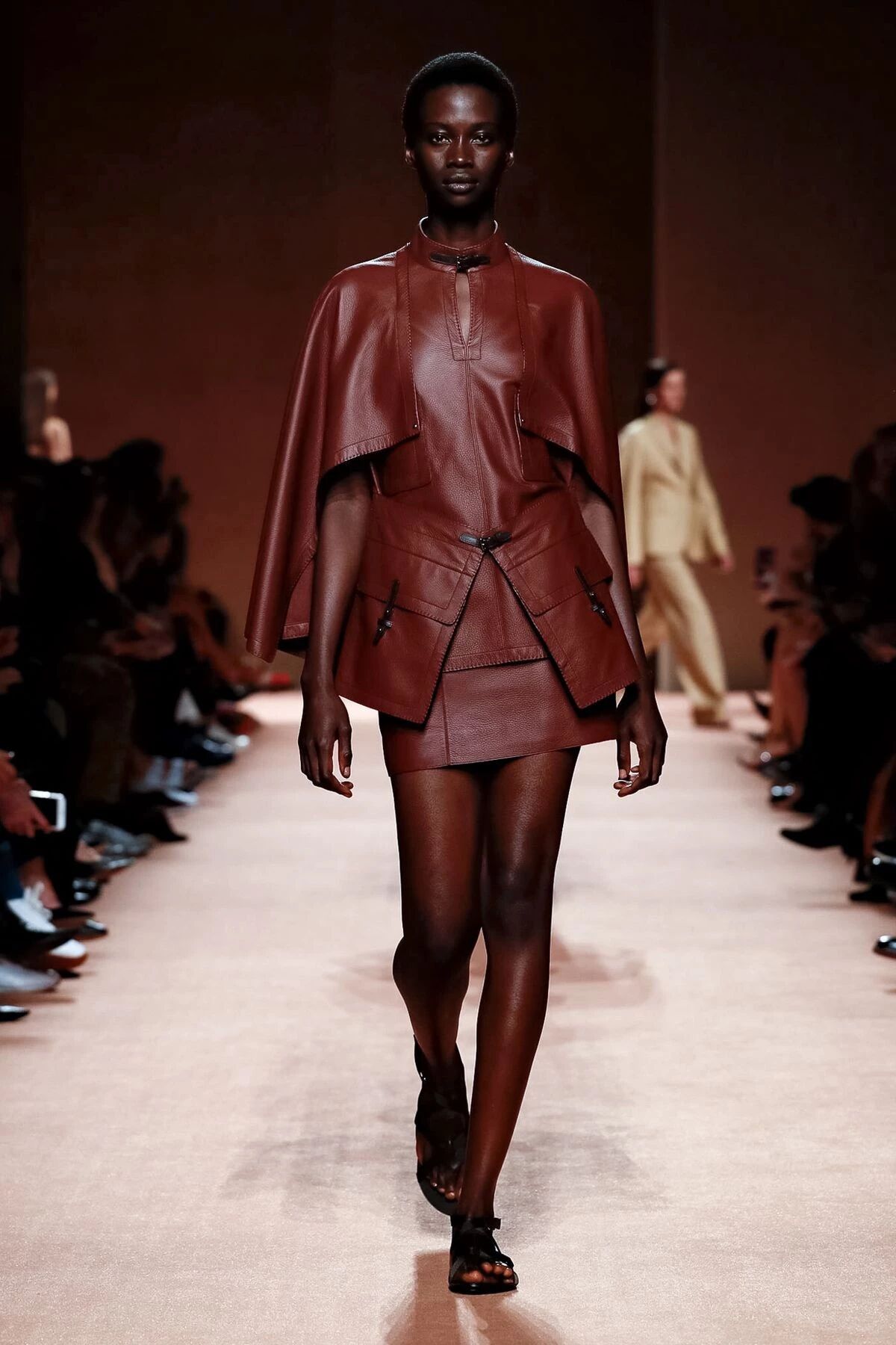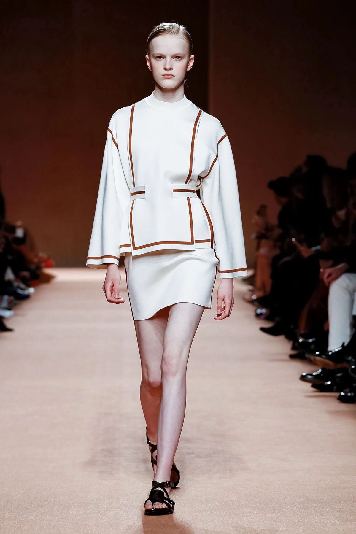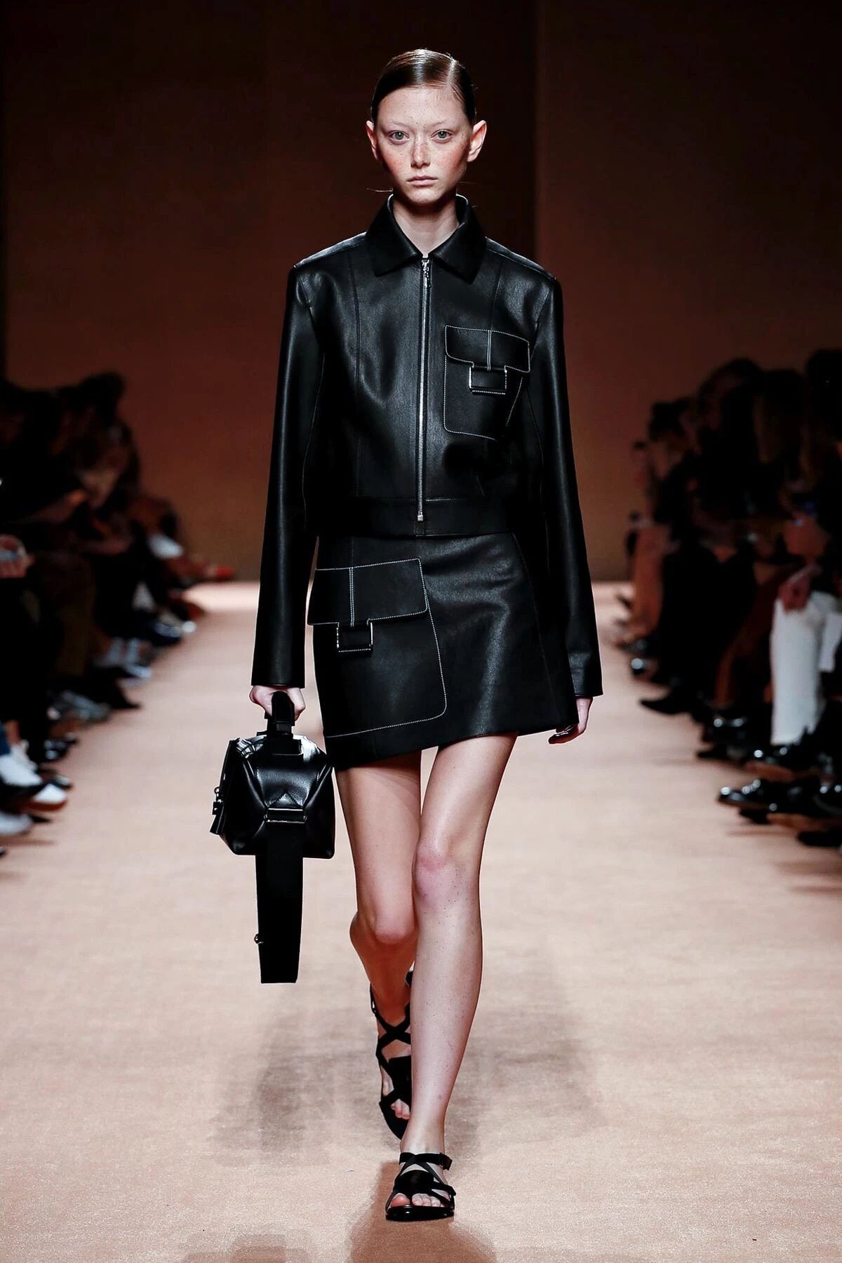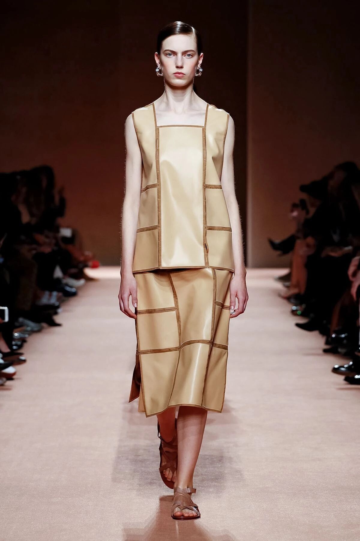 Nadège Vanhee-Cybulski不仅重组了金属扣,还在软料皮革上运用了迷你皮带扣,使本来极简的裙摆尽显设计感与层次感。而网眼皮革更是有一种摩登性感的格调。就如Nadège Vanhee-Cybulski所说,她喜欢将Hermès的经典风格注入现代的生活观。