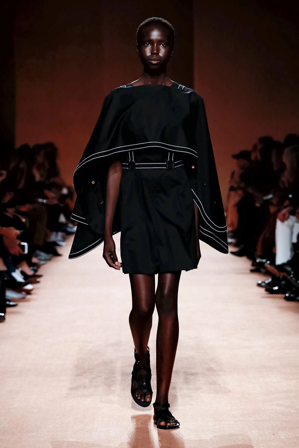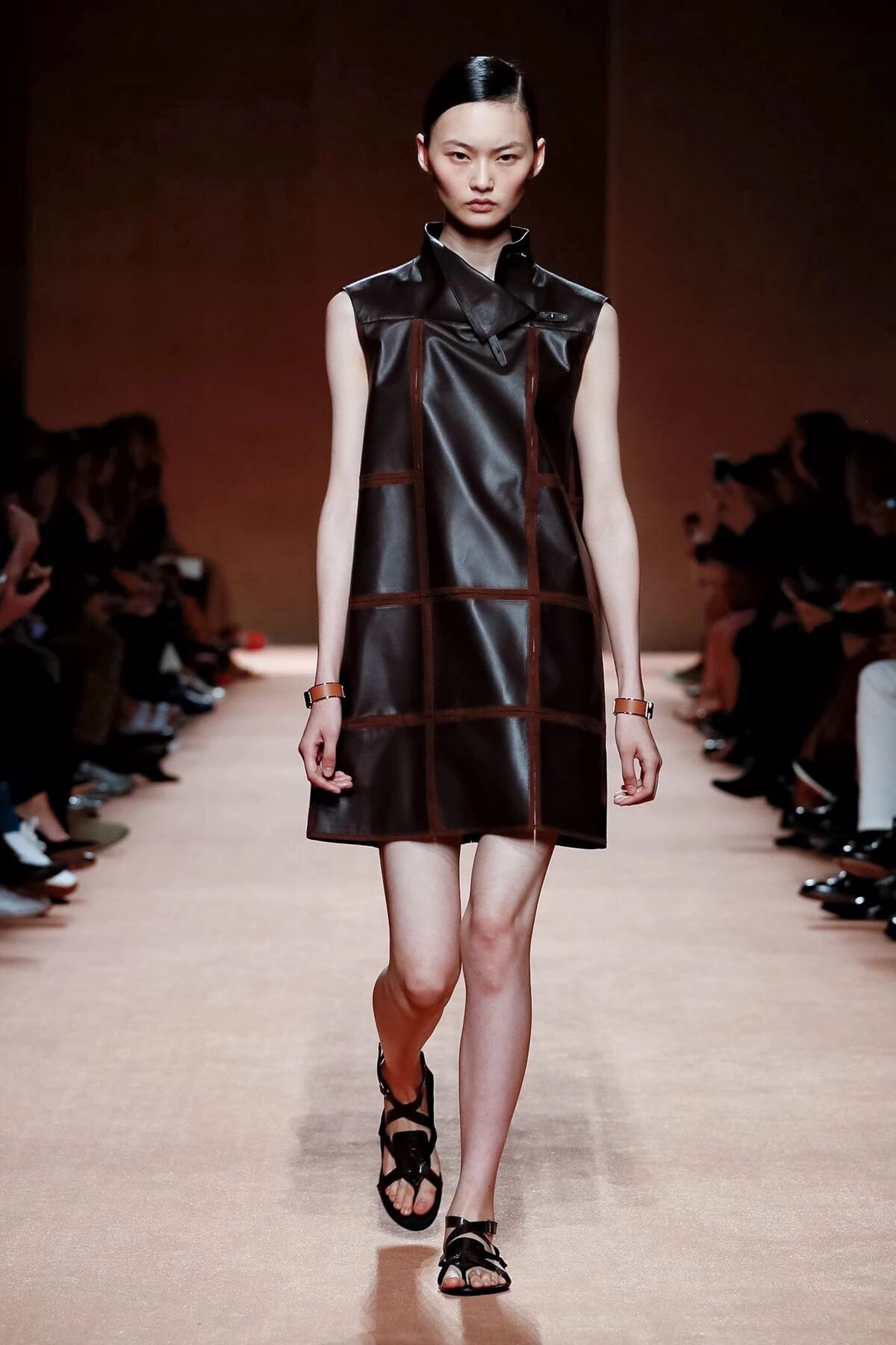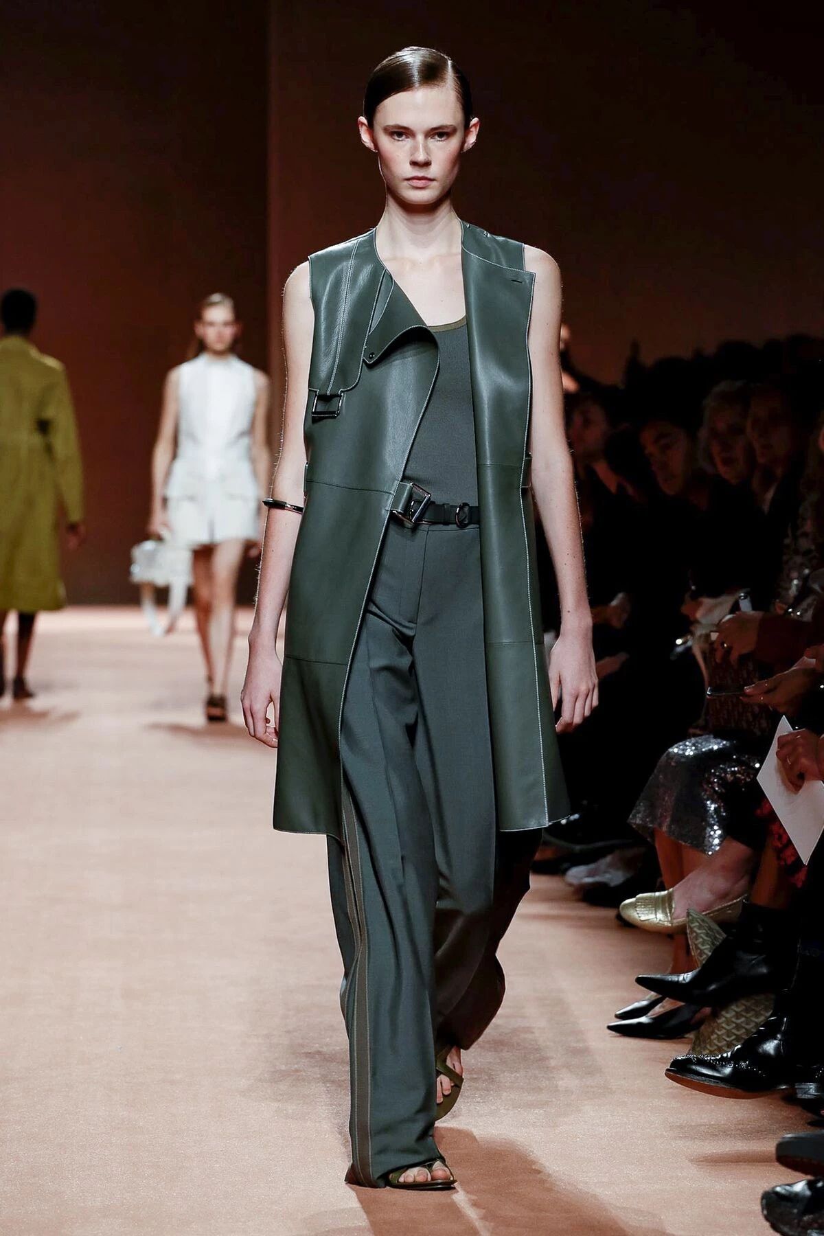 Nadège Vanhee-Cybulski不仅重组了金属扣,还在软料皮革上运用了迷你皮带扣,使本来极简的裙摆尽显设计感与层次感。而网眼皮革更是有一种摩登性感的格调。就如Nadège Vanhee-Cybulski所说,她喜欢将Hermès的经典风格注入现代的生活观。