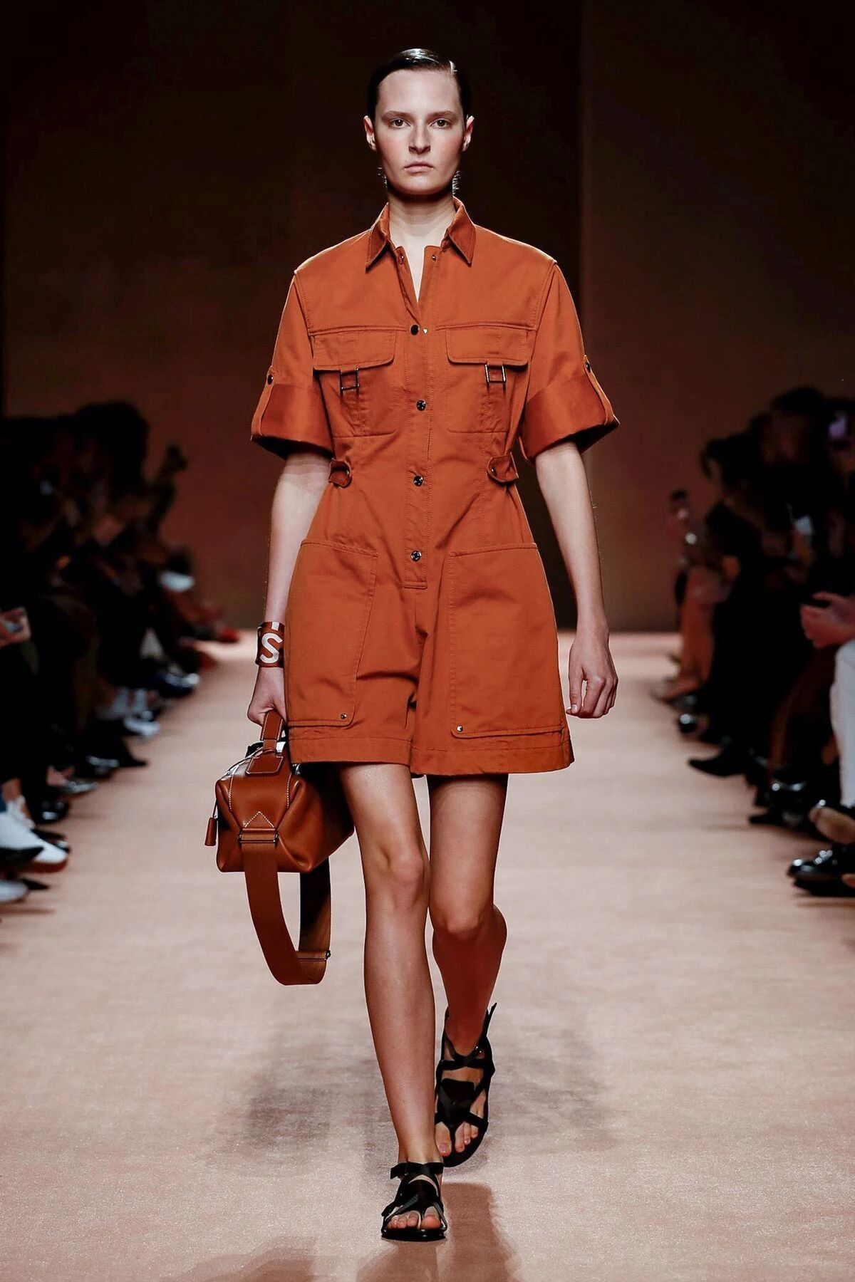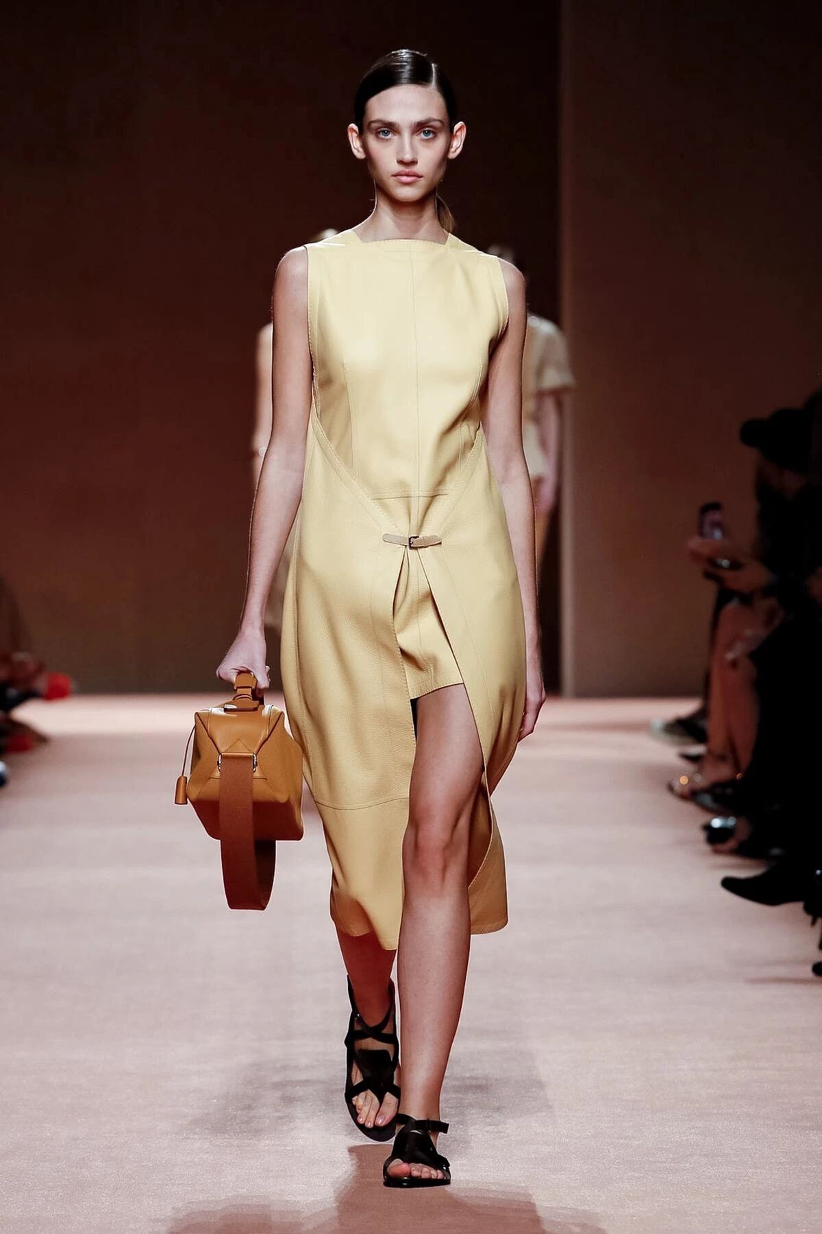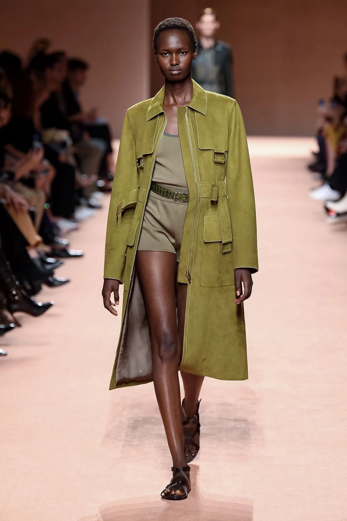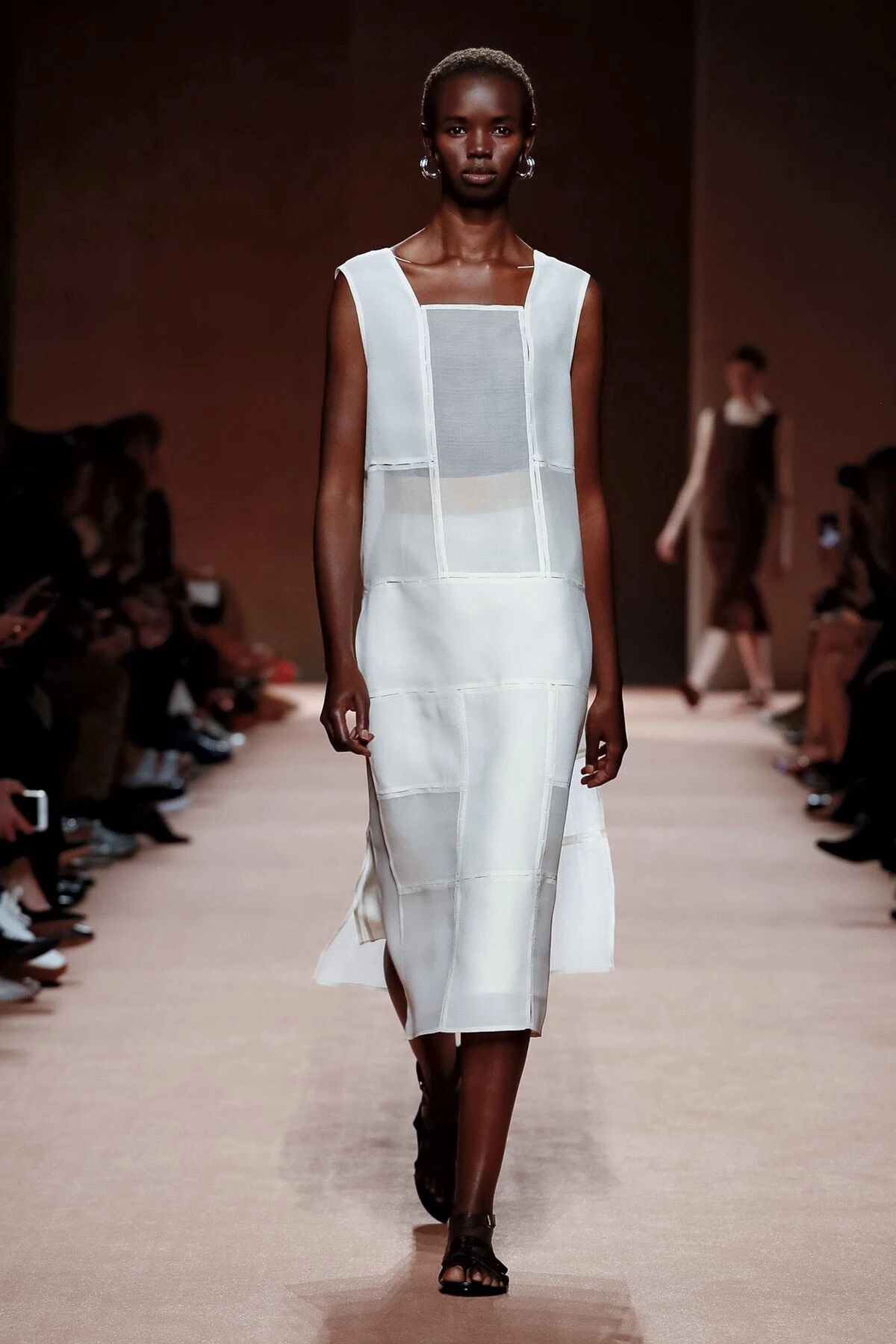 Nadège Vanhee-Cybulski不仅重组了金属扣,还在软料皮革上运用了迷你皮带扣,使本来极简的裙摆尽显设计感与层次感。而网眼皮革更是有一种摩登性感的格调。就如Nadège Vanhee-Cybulski所说,她喜欢将Hermès的经典风格注入现代的生活观。