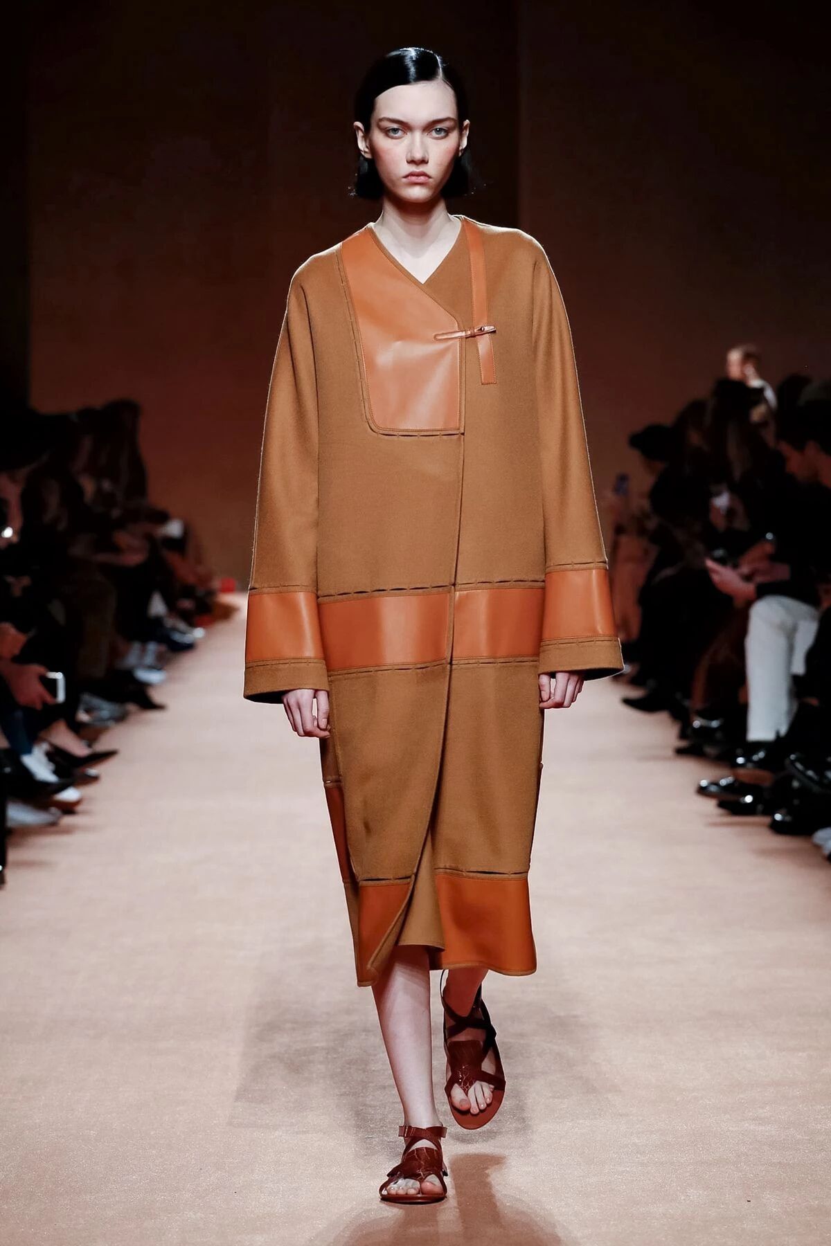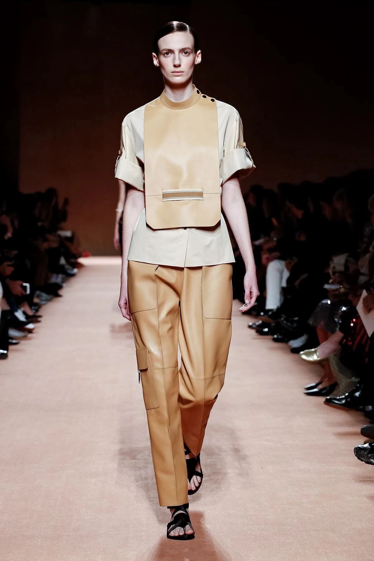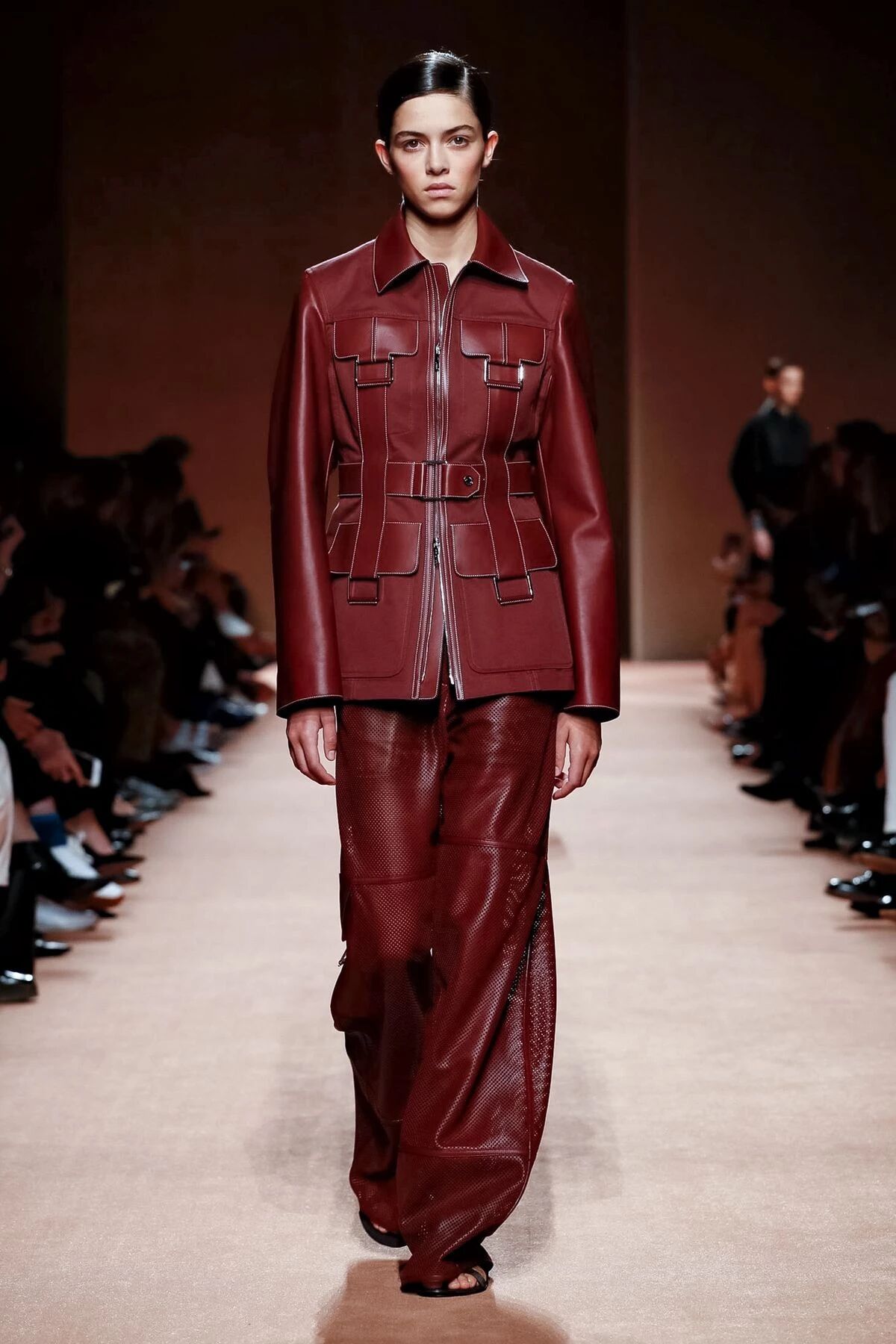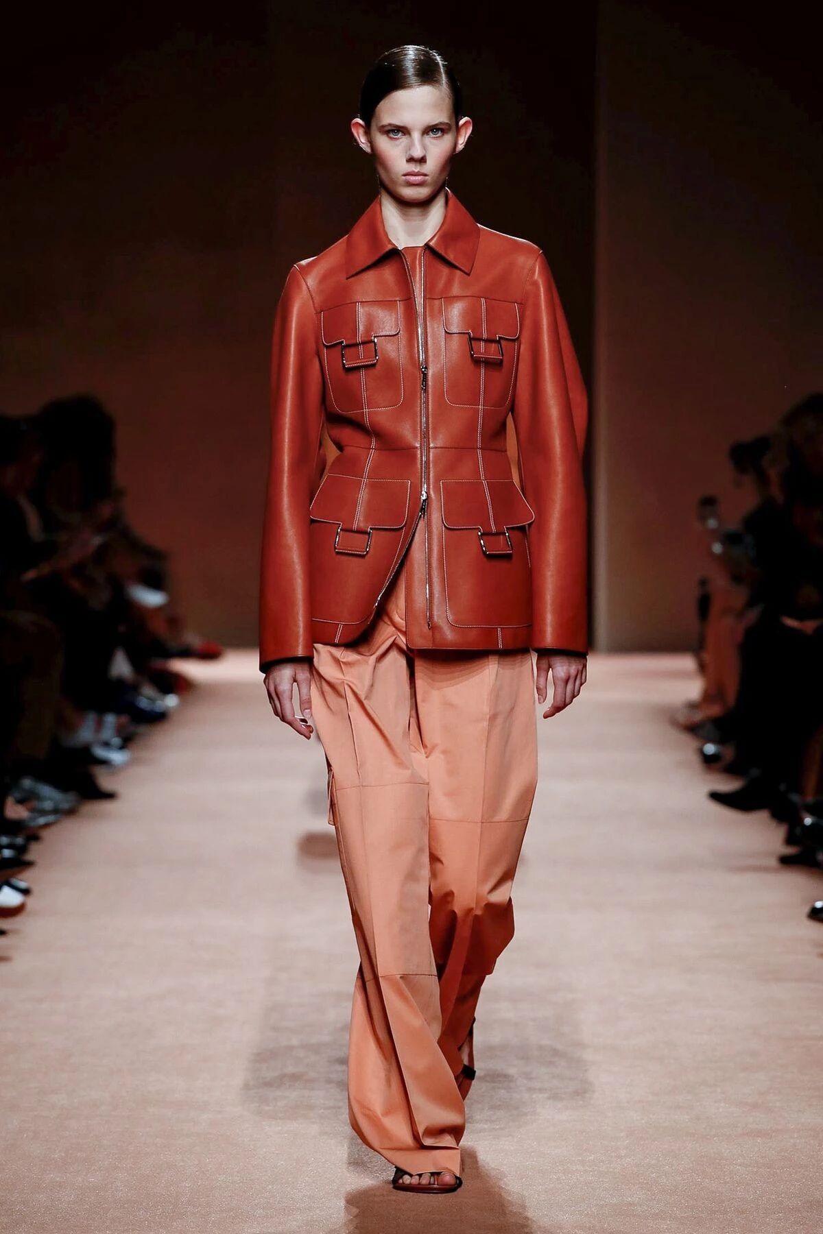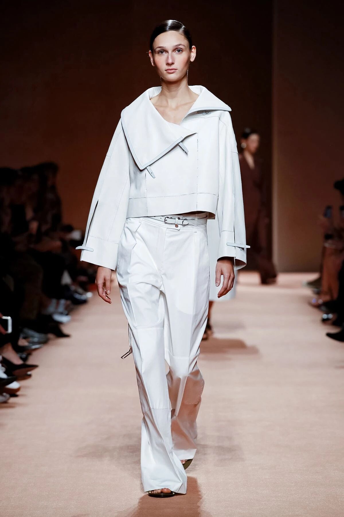 皮革作为Hermès的典型基因在这一季中欣然亮相,但Nadège Vanhee-Cybulski用她的巧手给这一经典元素又创造了新的可能。简洁利落的轮廓和精良果断的剪裁都无可挑剔,凸显着优雅又稳重的女性气质。皮革百褶裙的出现再次让人耳目一新,装在口袋上的金属扣被缩小、重新排列,“系”于腰间或装点半裙,这一切的新奇与个性在此刻皆为合理。