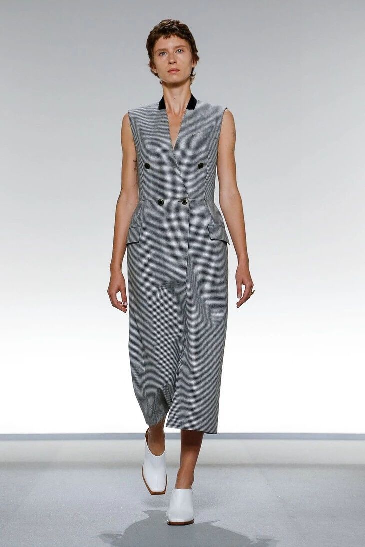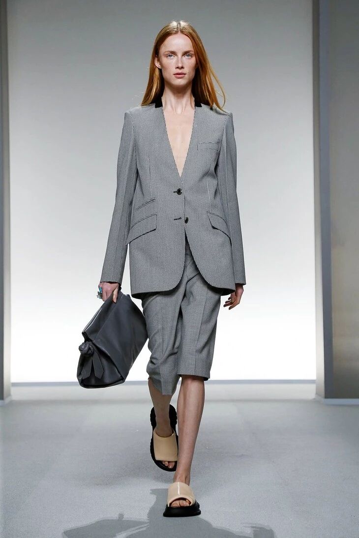 西装剪裁不再是过去几季流行的超大廓形,线条依旧硬朗但更为流畅流畅,硬挺的面料在拉长的整体比例上,营造出一个纤细而富有力量感的形象。