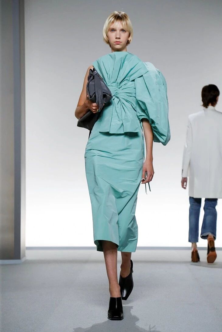 一开始听着躁动的嘻哈背景音乐,也许会以为走错了秀场。但当开场造型走出,那份从容和优雅,除了巴黎女人还能属于谁呢?柔软的无袖皮上衣泛着细腻的皮革光泽,和塔夫绸半裙相互映衬,精分的搭配美学不露痕迹。被设计成领巾的领口细节,带出了下一个伏笔。
