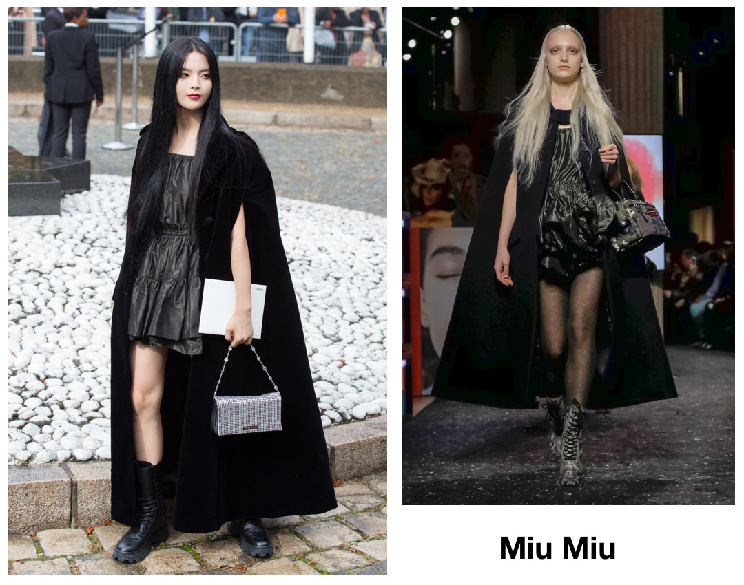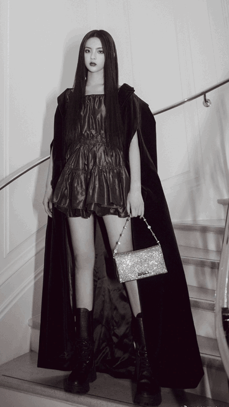 黑色丝绒斗篷使她女王气场全开,优越修长的身材将属于Miu Miu的优雅与精致完美展现。