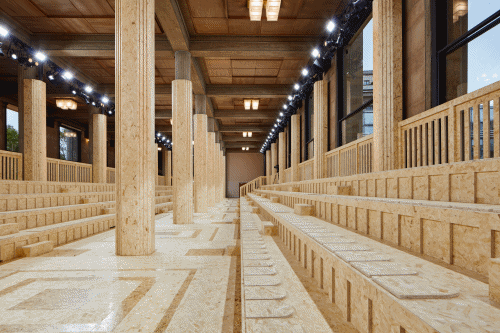 Miu Miu 2020春夏系列于巴黎耶纳宫(Palais d’Iena)盛大发布。本次秀场可以用失衡之殿来形容。AMO一改August Perret多柱式宫殿的严谨性,颠覆了原有的空间结构,嵌入偏离中心的装置。