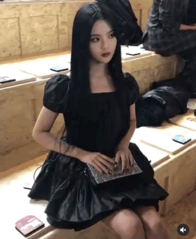 进入秀场后脱下了外套,只剩下里面的黑色娃娃裙,配上黑发和红唇,真是一个暗黑系的美少女。