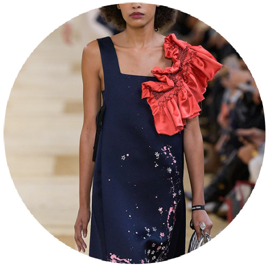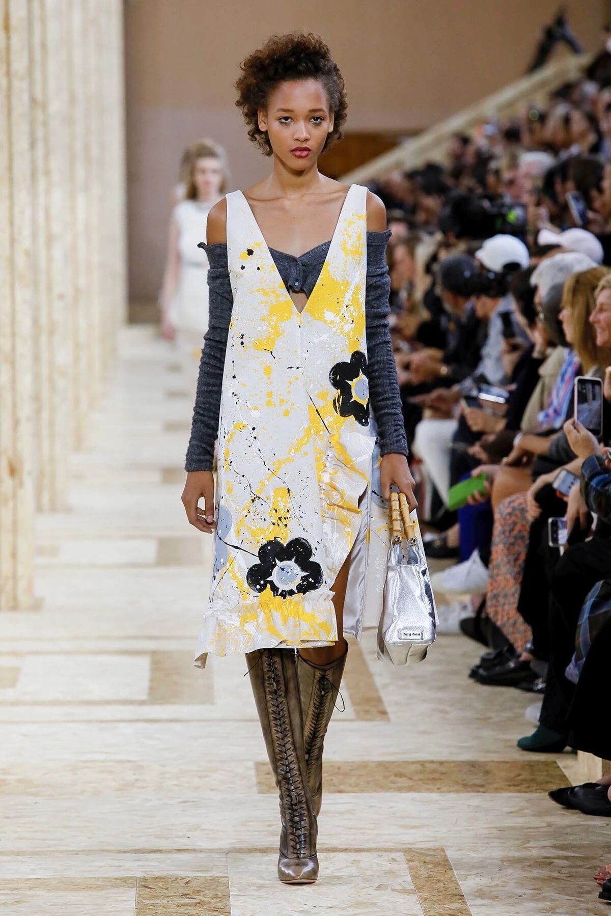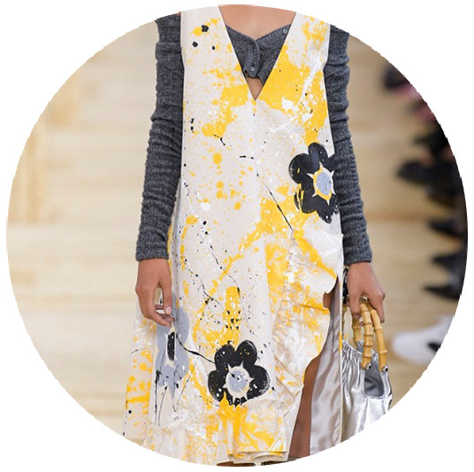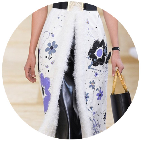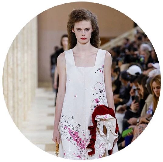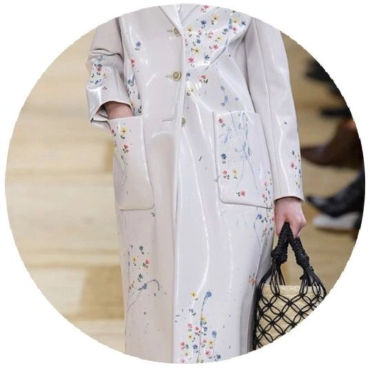 这一季女孩们都穿上了多彩的颜色,让日常、传统的材料被赋予不同的质感,别致又带着些许活泼。特别的是在不同材质上的不同花朵泼墨装点,抽象的印花像随性的泼墨一样潇洒自然,为整体造型增加小细节。