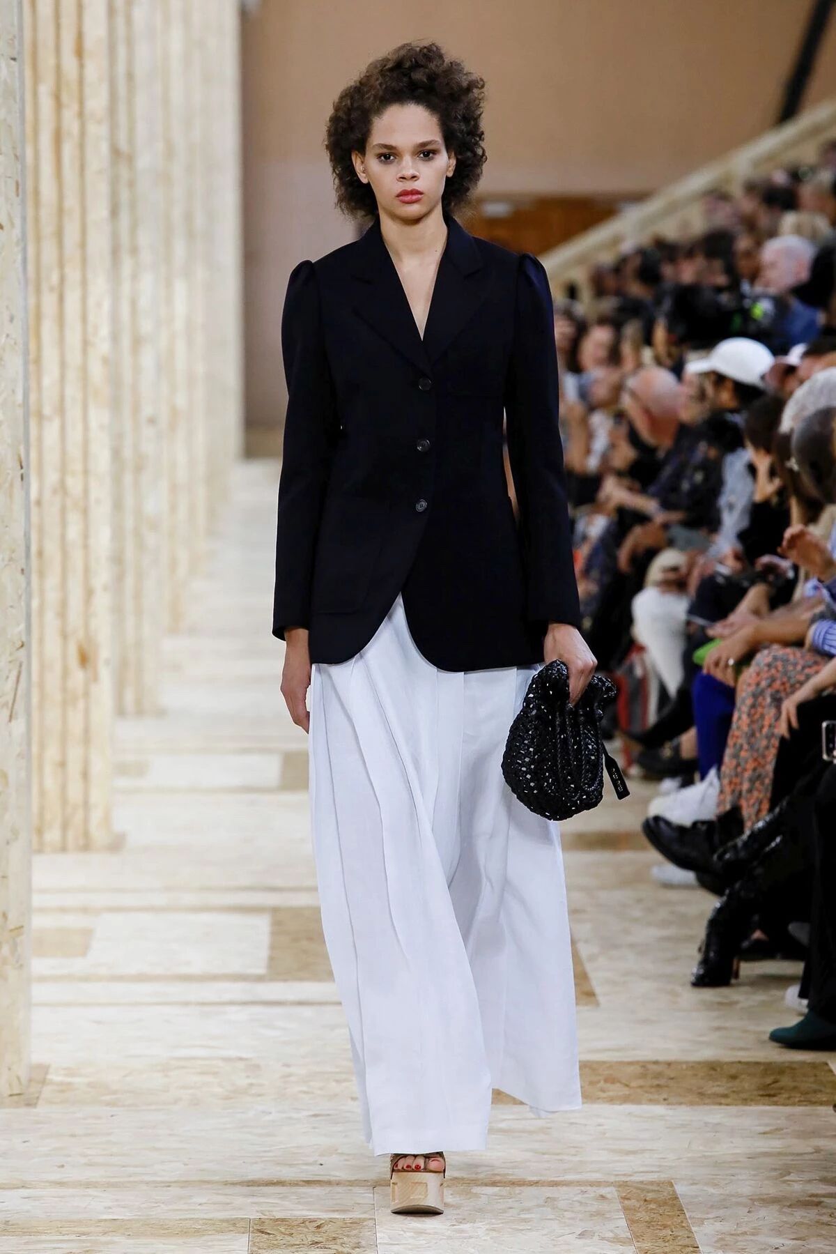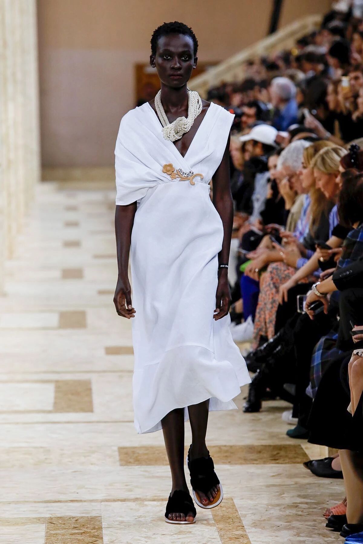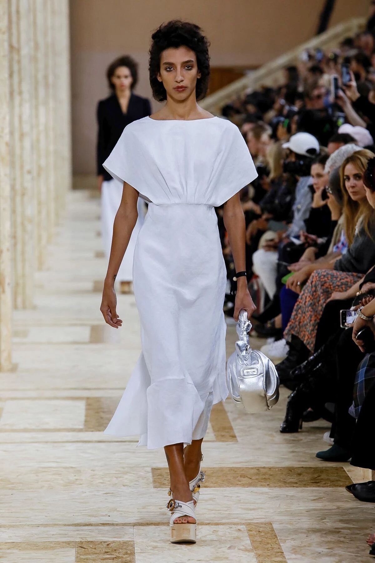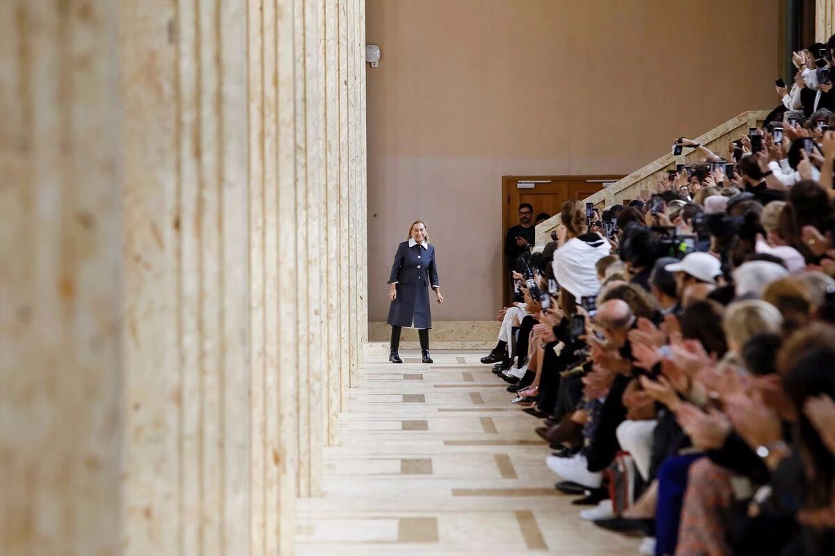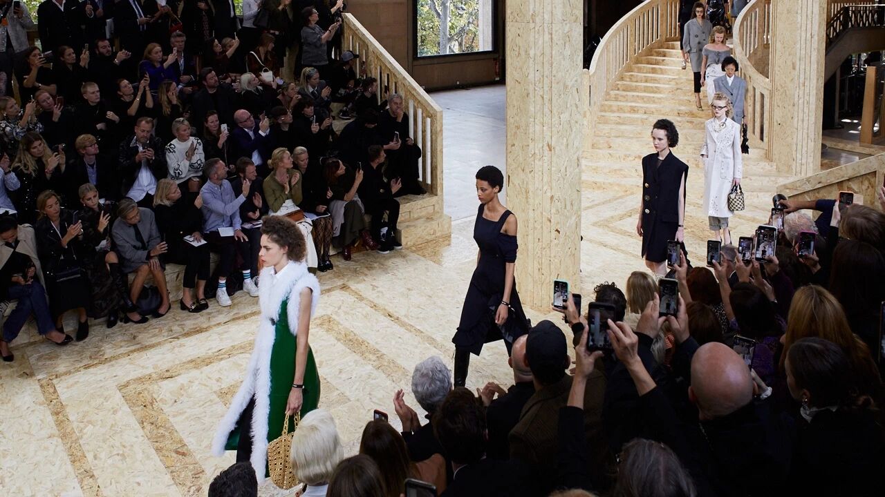 线性布局的基础上,焕然一新的柱廊成为模特走秀的核心路线,在空间与时装之间唤起新的关联,营造出失衡的宏伟之感。