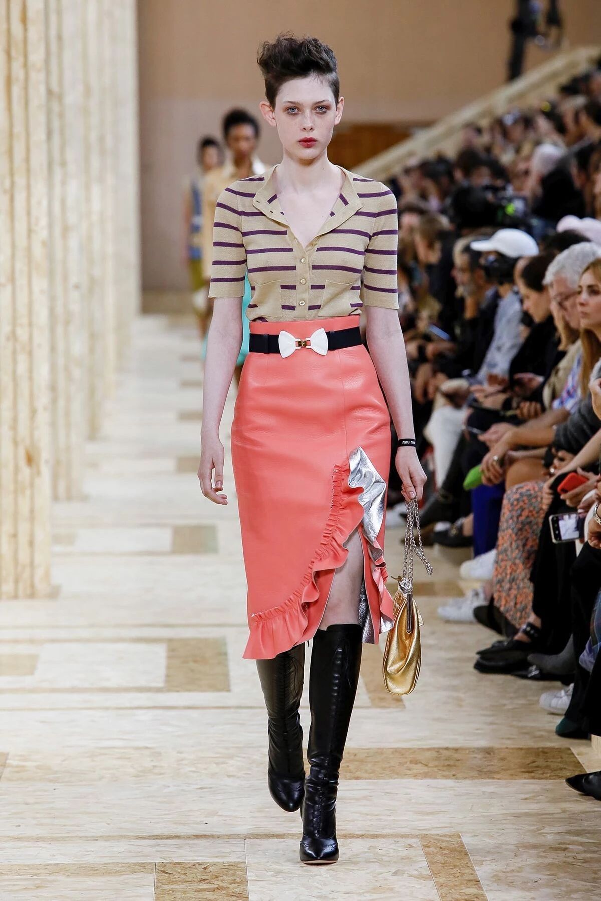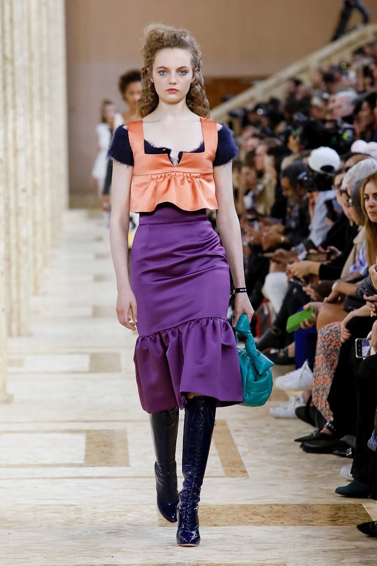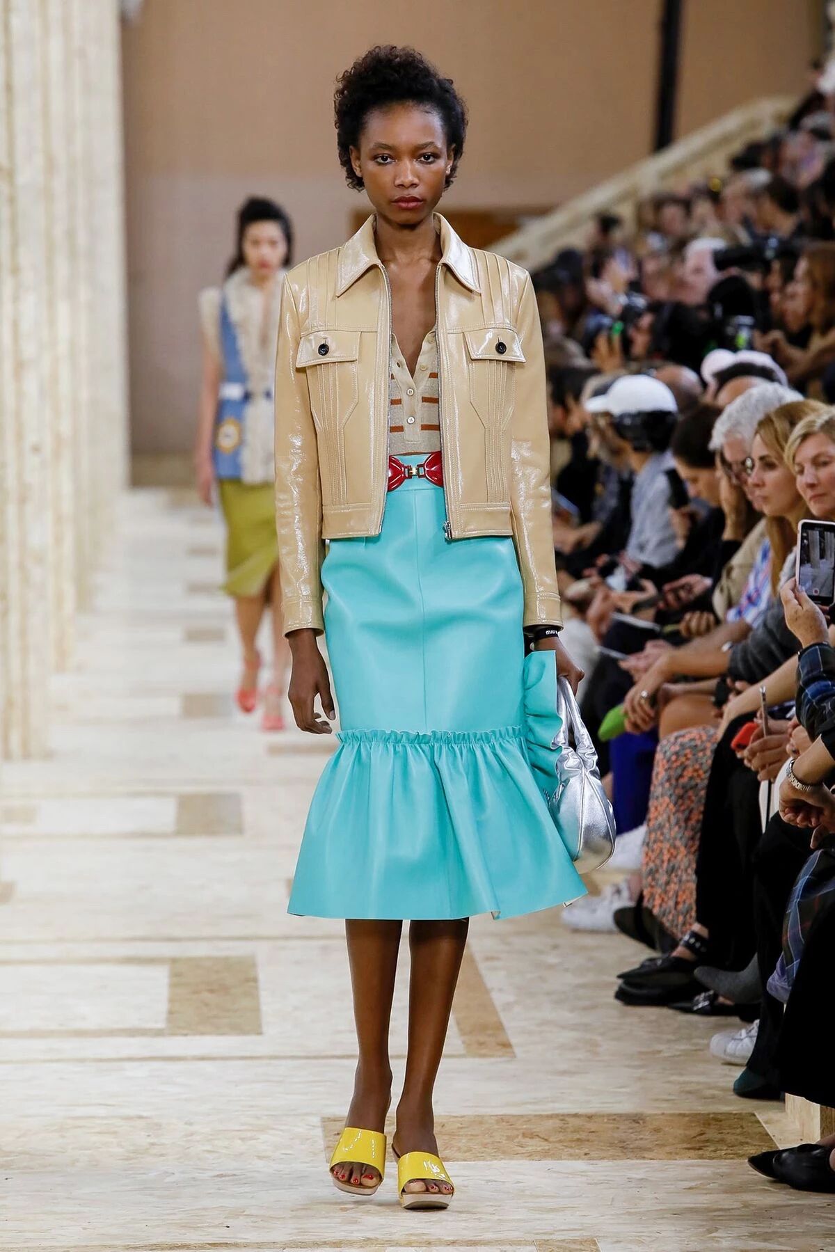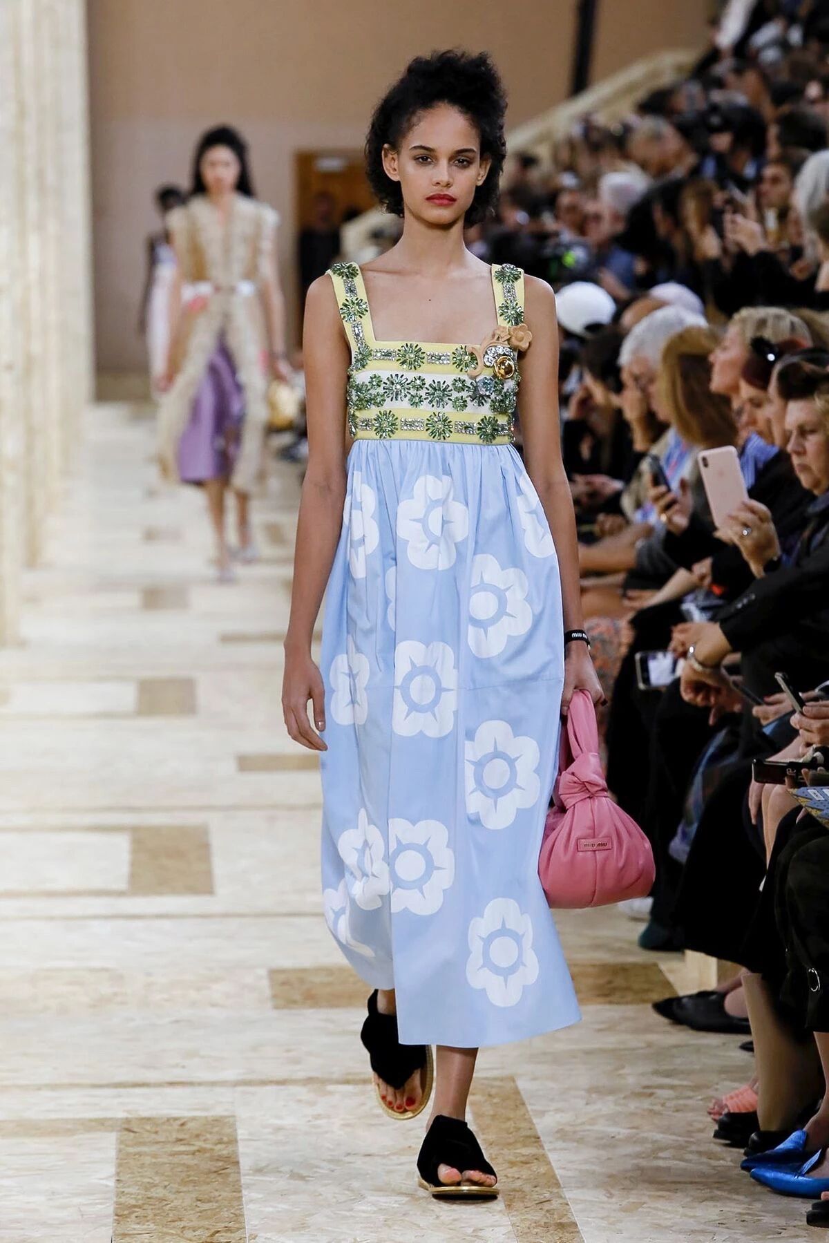 有句老话叫:“女孩的心思你别猜”!随后的服装无论从设计还是印花还是色彩都变得十分丰富。Miu Miu 2020春夏系列组合了多重元素,各自元素相互碰撞,时装仿佛变身一场互动、一段对白。刻意和即兴轮番上演,严肃和戏谑相得益彰。