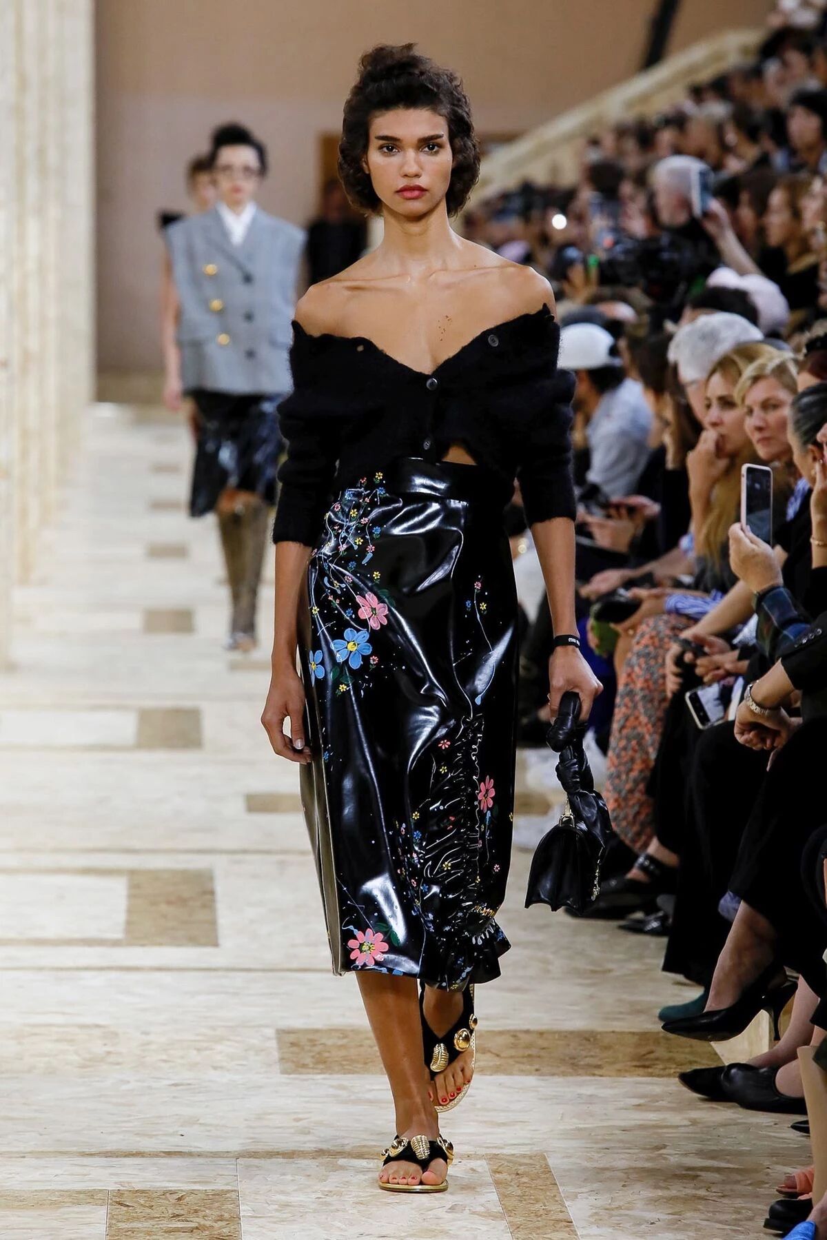 搭配字母T恤、亮面软羊革半身裙,脚踩Miu Miu厚底玛丽珍鞋,俏丽少女十分别致耐看。真是让人期待超越美美的秀场Look是什么样子呢?