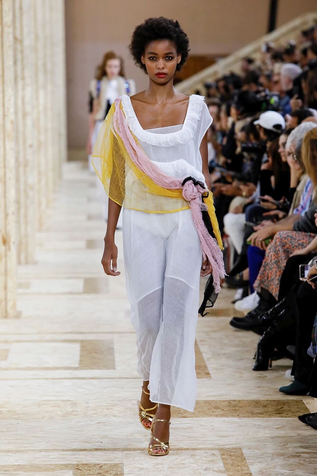 开场就点出了本季一个重要的服装元素,就是围裙装。将围裙演变成宽肩带和百褶裙的结合,既削弱了百褶裙的“老气”,又让这个美丽的女孩变得不那么触不可及,还可以有效的修饰溜肩。