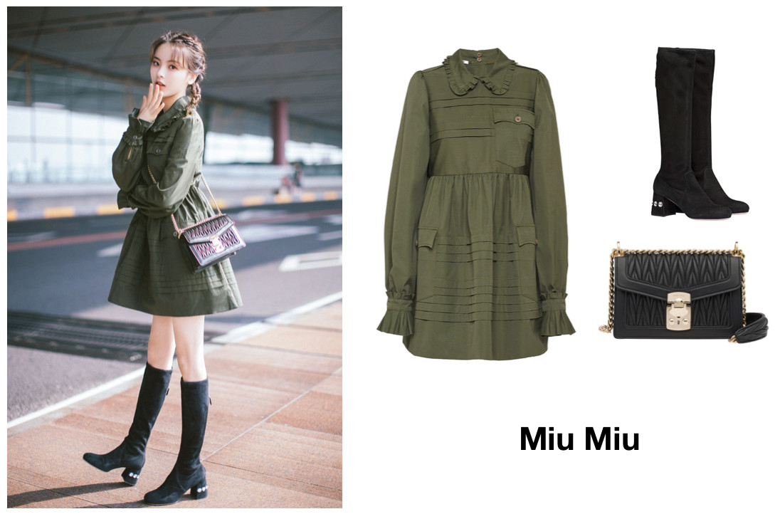 杨超越再次以Miu Miu官方唯一受邀的中国艺人的身份出席巴黎时装周品牌时装秀,出发巴黎时在机场身穿Miu Miu军绿色府绸连衣裙,搭配Miu Confidential黑色手袋和麂皮长靴,利落中不乏扑面而来的青春气息,时尚与年轻的碰撞,诠释出不一样的独特青春。