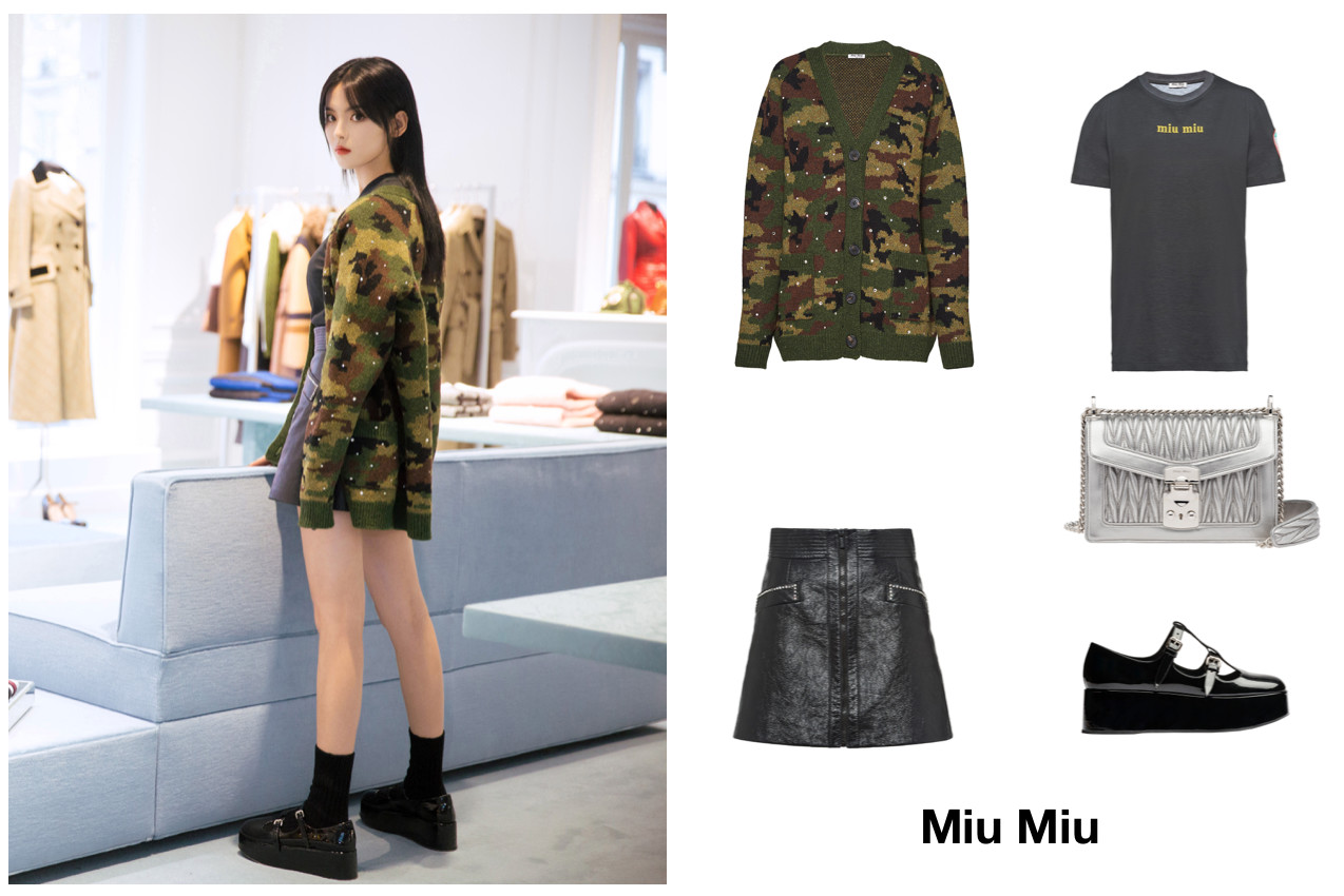 超越妹妹到达Miu Miu巴黎门店时,不同于机场的可爱裙装,换成了水晶装饰的迷彩开衫十分具有青春活力。