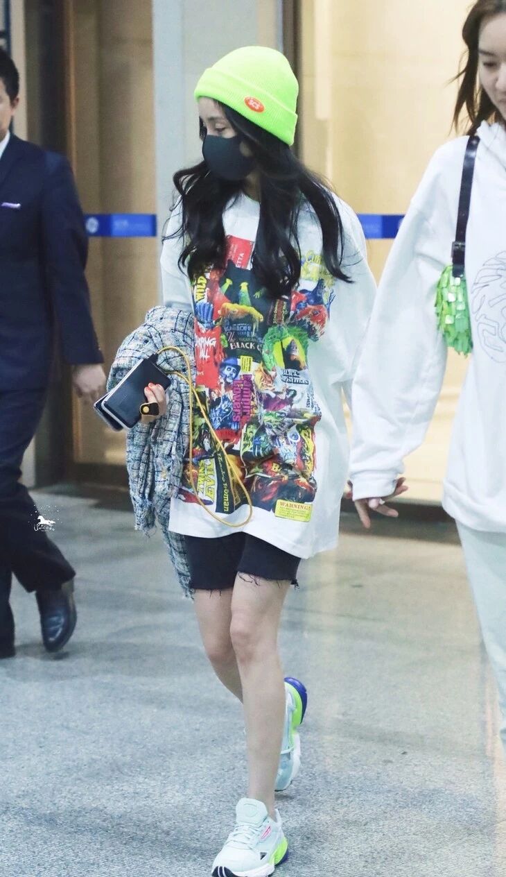 Baby同样是行走的“超垮”风格种草机,她和杨幂一样喜爱“上长下短”和“上宽下窄”的穿搭公式,荧光色卫衣搭配单车裤,是整个机场最酷的girl没错!但这个长度的单车裤,腿形一般的小伙伴不建议尝试。