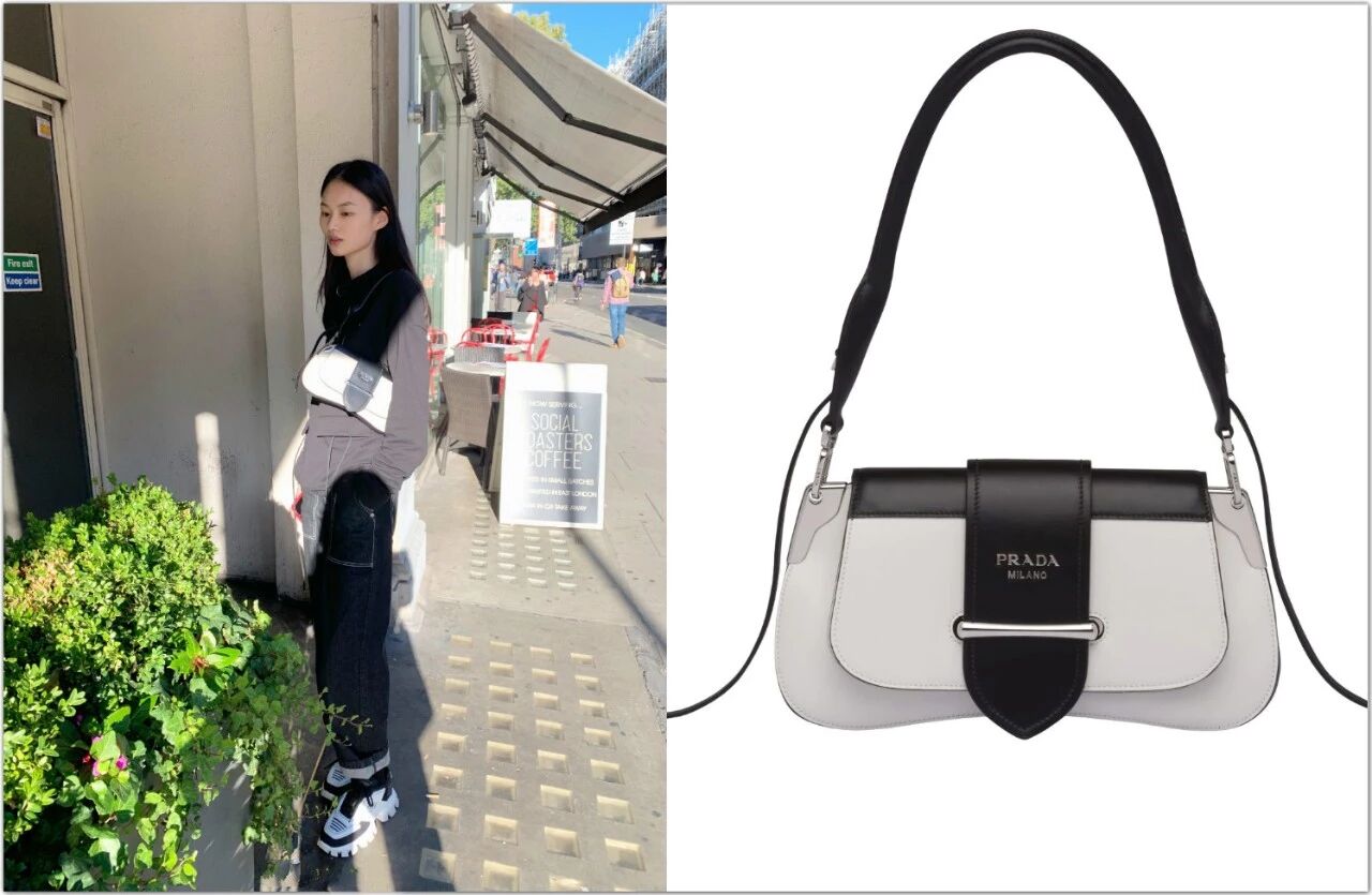 再加上强势复古回潮的Prada Sidonie系列手袋,黑白撞色高级又特别,穿衣简单时不妨学贺聪用它来给整体造型“提气”。