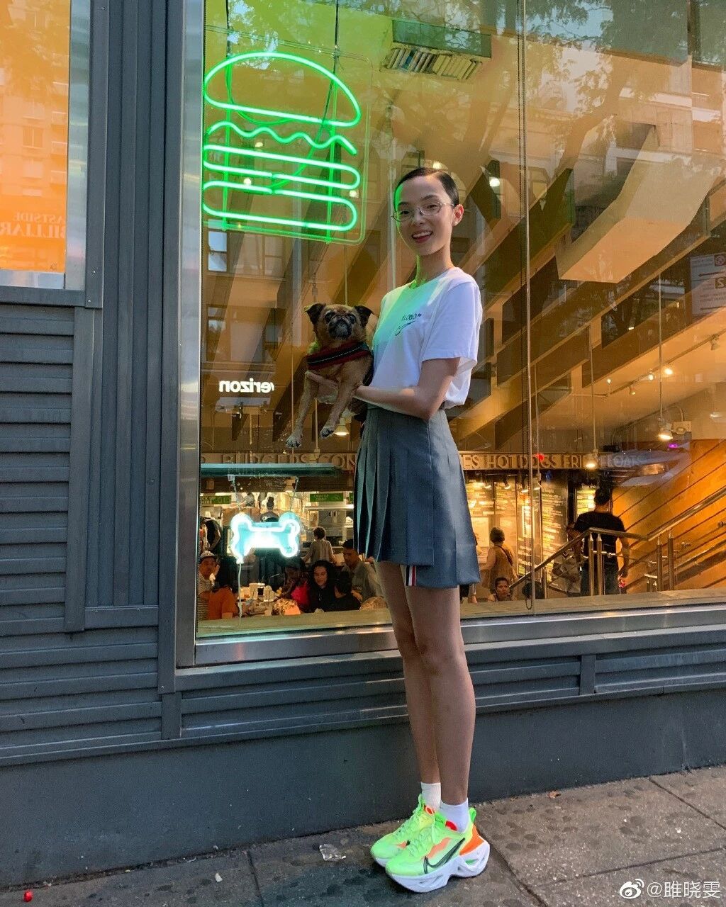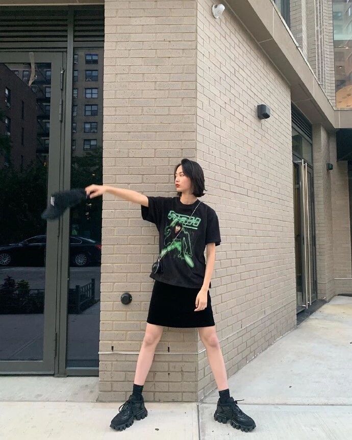 比如一件简简单单的白T,搭配Thome Browne的高腰百褶裙就她校园感十足,脚踩一双厚底运动鞋行走在街头,架上眼镜还真的像是刚下课的小学妹。