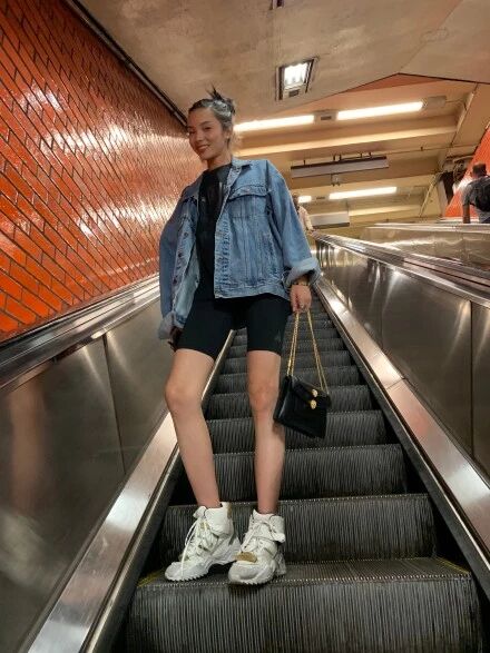在纽约地铁拍随手拍的一身,基本款单宁外套搭配运动短裤,加上Bvlgari × Alexander Wang的限定手袋,就带出了时髦感。